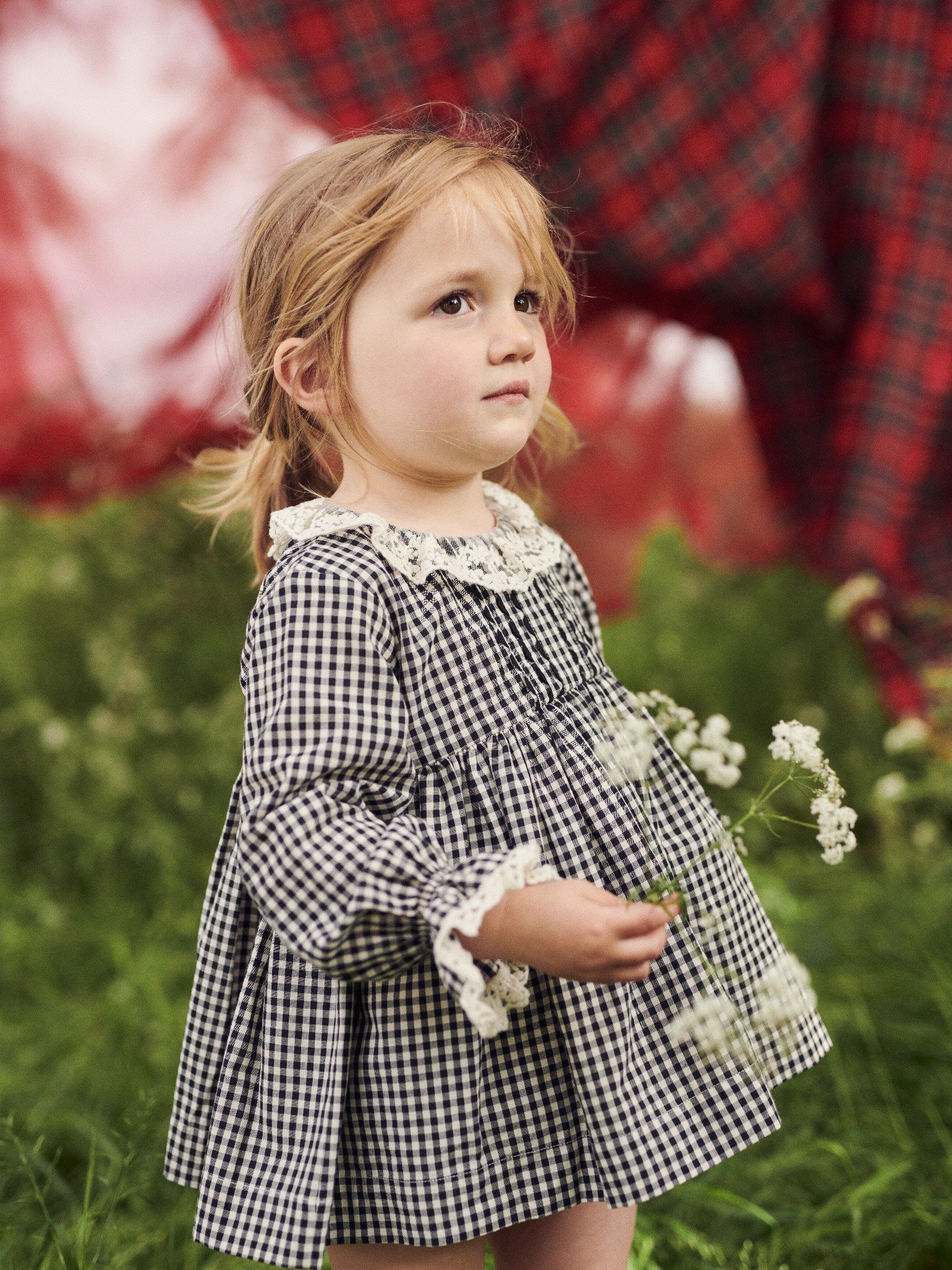 Referencing nostalgic party styles, La Coqueta's Aurelia Baby Girl Set is sure to get you in the mood for the festive season. It's made from recycled woven cotton in a charming gingham check in monochrome tones, and designed with a timeless empire-line two-piece that flows into a floaty skirt that swishes with every move, fully lined with pure cotton that is kind to even the most delicate skin. Delicate touches include a statement French lace collar, matching cuff trims, and scalloped ribbon panels that effortlessly add vintage charm. The top fastens at the back with signature mother of pearl buttons for fuss-free changing, complete with matching bloomers for full coverage, and makes the perfect party set option for all those winter festivities with your baby girl. Coordinate with a big sister wearing the Aurelia Girl Empire Dress for those adorable, perfect-picture moments.