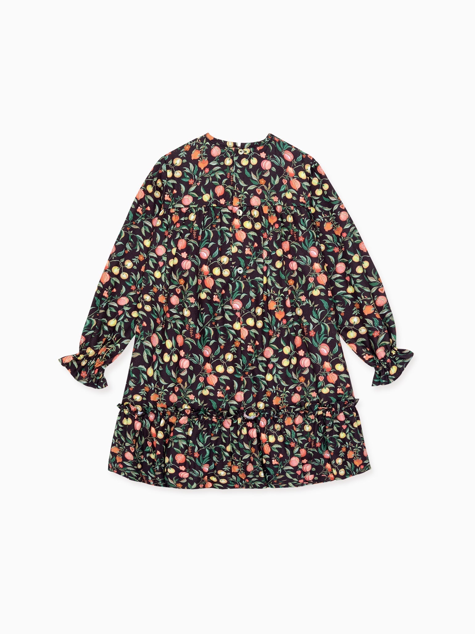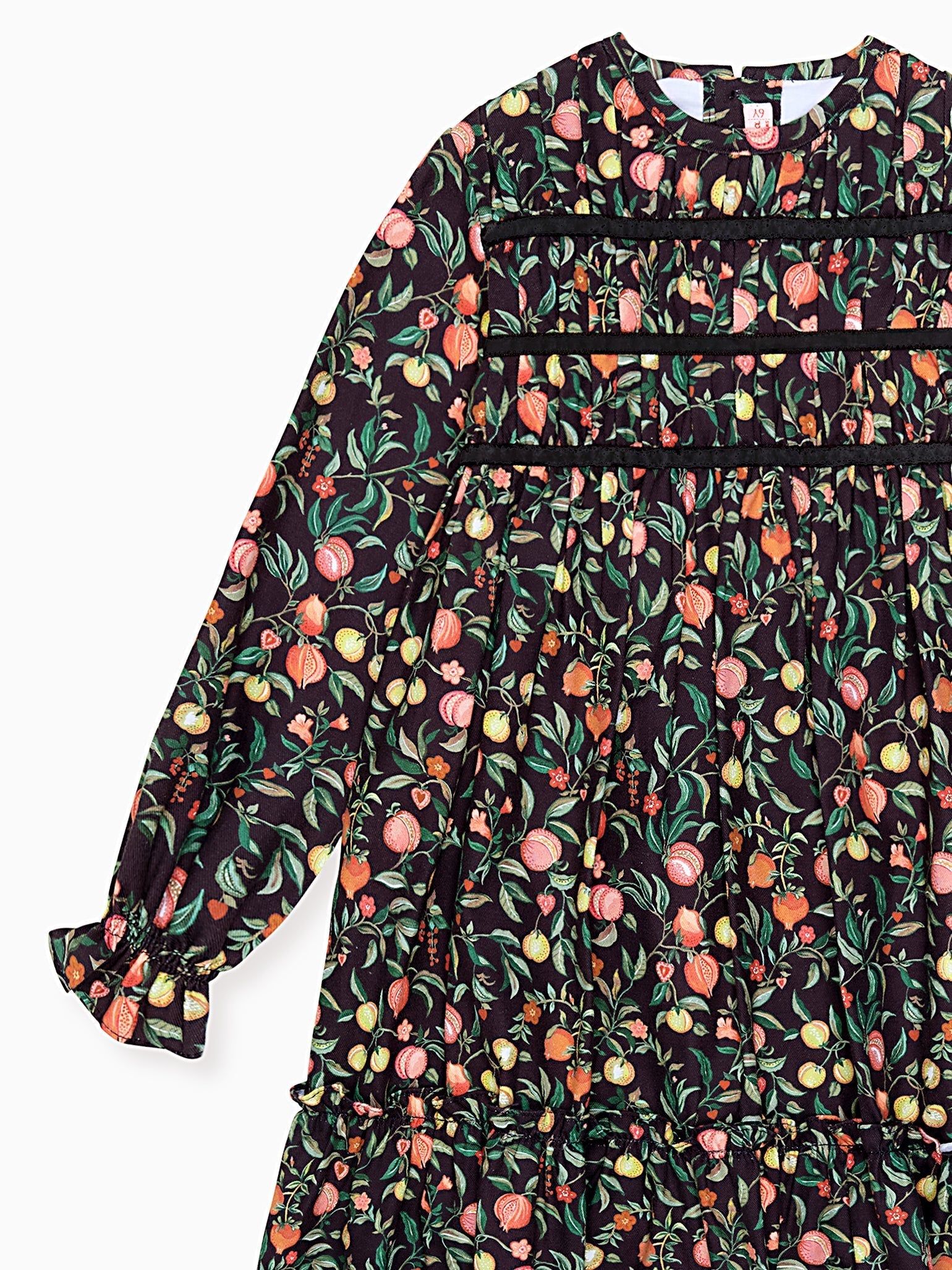 Flowing, vintage-inspired silhouettes define La Coqueta's aesthetic, and the Belia Girl Smocked Dress is a stunning embodiment of this style. Crafted from luxuriously soft pure cotton, this dress feels light and elegant, decorated with an illustrative pomegranate print in shades of red and green on a black base. It is perfect for so many events in your little girl's diary this season, effortlessly dressed up or down depending on the occasion, with long blouson sleeves, gathered at the cuff for a voluminous effect, and a flouncy tiered fit-and-flare silhouette that swishes with every move. The bodice is artfully pleated, adorned with black ribbon panels across the yoke. It fastens with a signature mother of pearl button placket at the back, and is fully lined with pure cotton for extra warmth and comfort all season long.