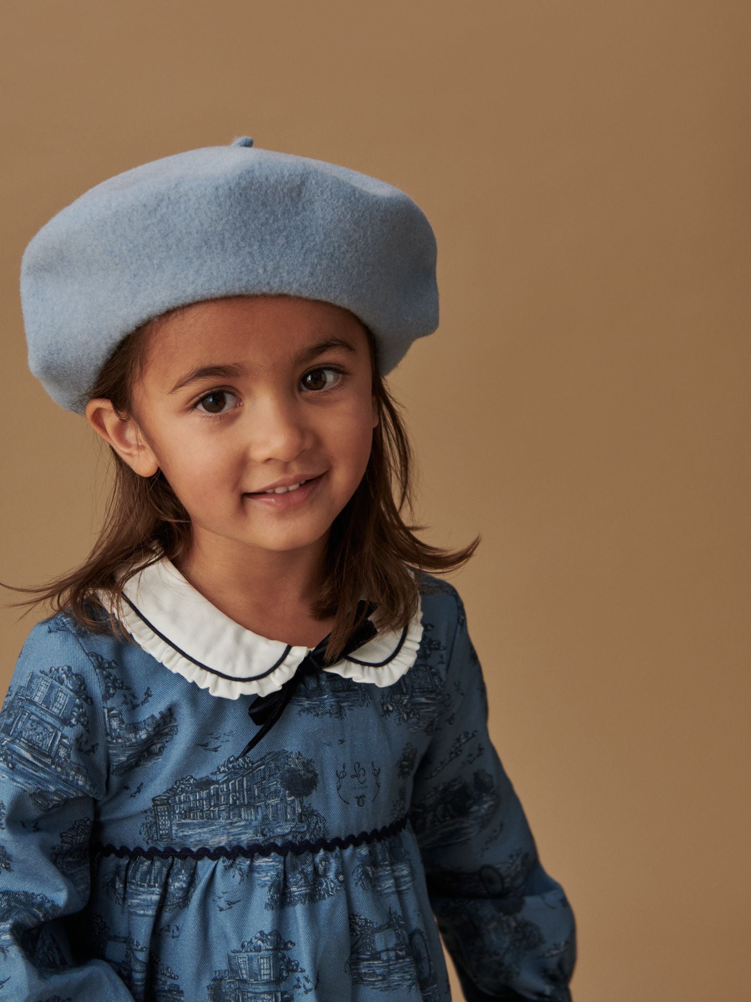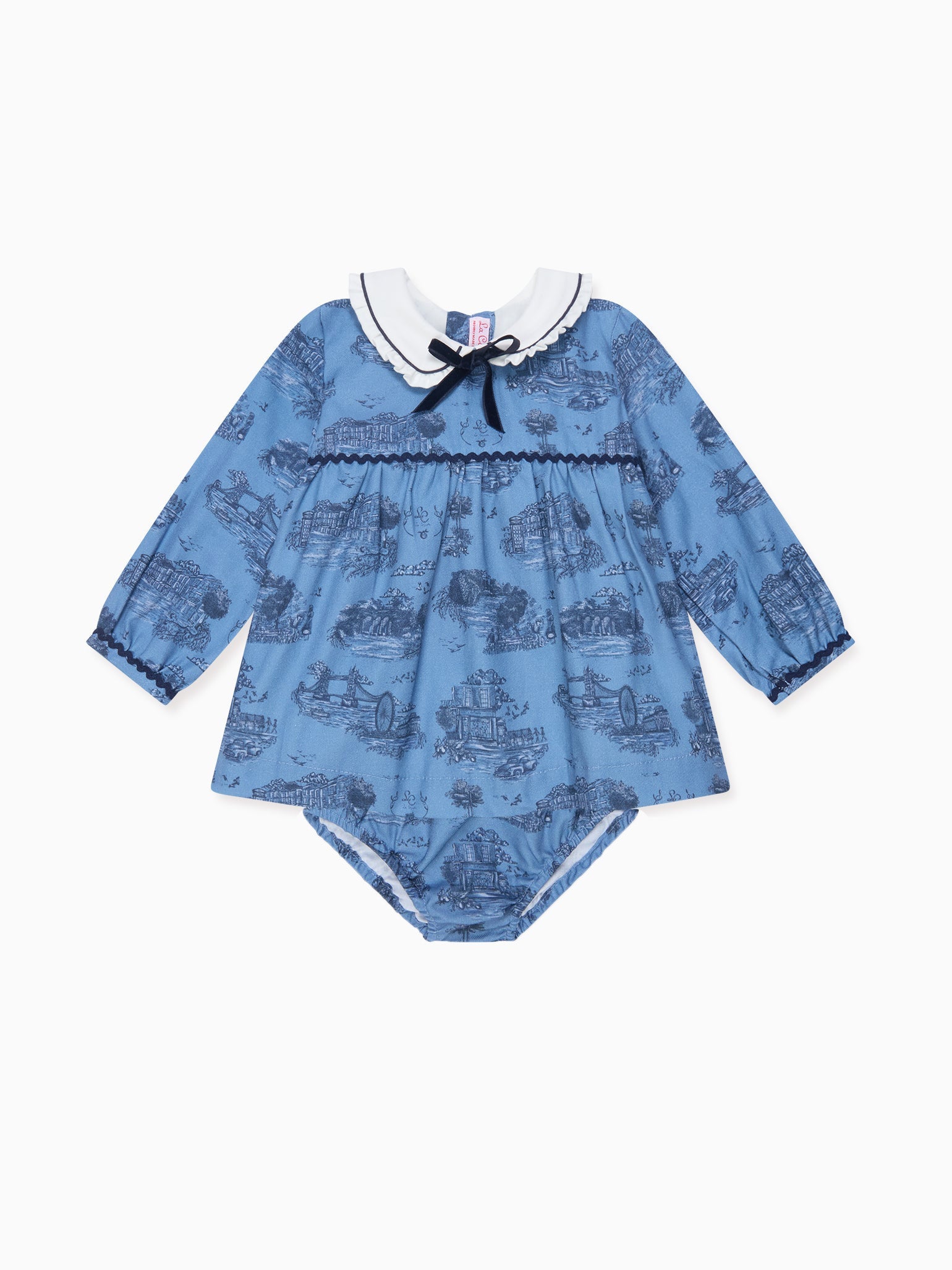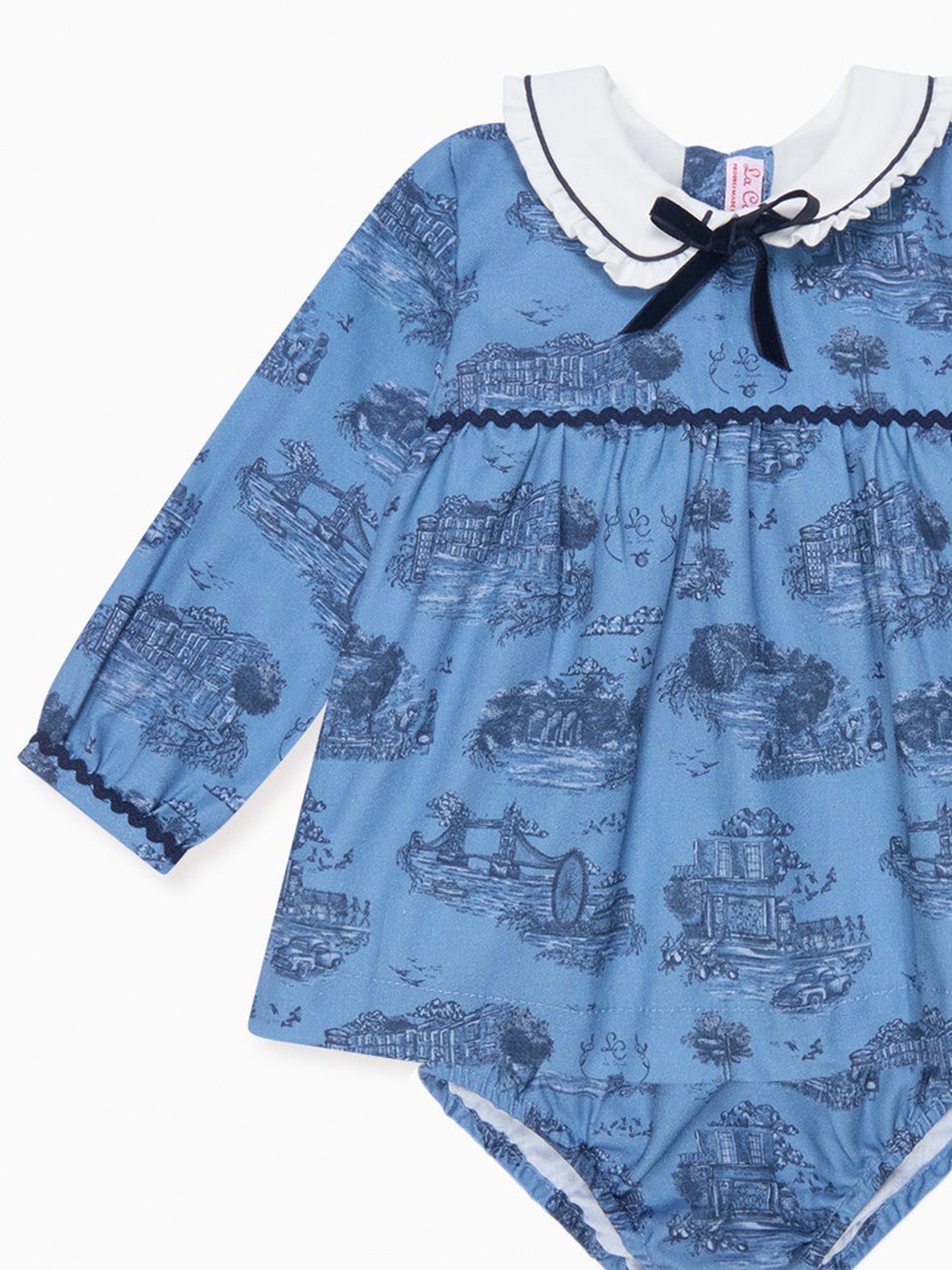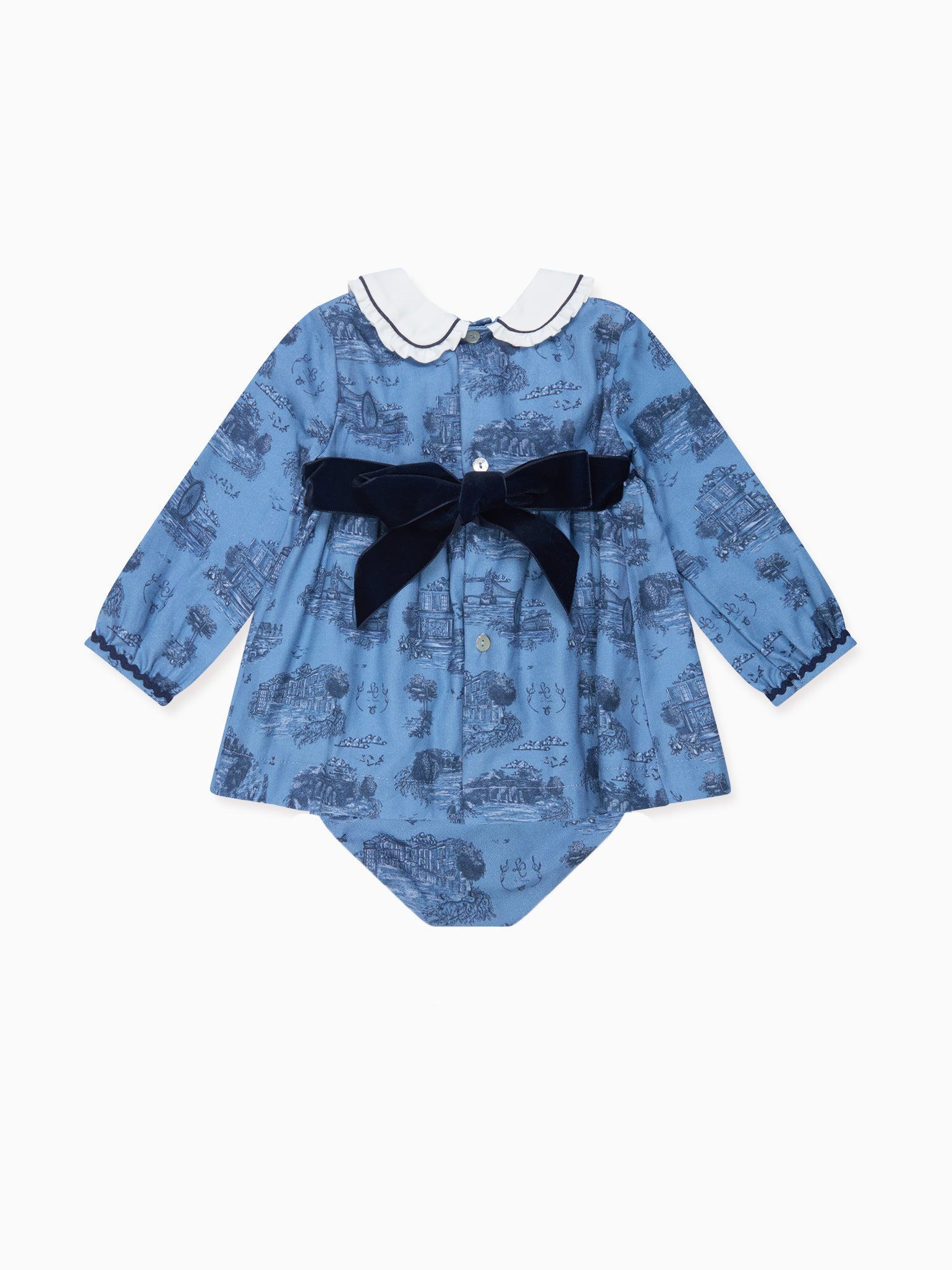 La Coqueta's prints pay homage to love for a bygone era, with our devotion to nostalgia and finery shining through in the Luisetta Baby Girl Set. Crafted from pure cotton in a stunning navy Toile De Jouy print on a pretty blue base, the top has a charming fit-and-flare silhouette that gives way to a cinched waist and flowy skirt, decorated with a ric rac ribbon panel and a self-tie velvet bow that ties at the back, a Peter pan collar trimmed with delicate pleated trims and long sleeves with ric rac finishes. A set you and your baby girl will cherish, it has matching bloomers for full coverage and easy changing. It was crafted with special events and those picture-perfect moments in mind. Coordinate with a big sister wearing the Helena Girl Dress for those adorable, perfect-picture moments.