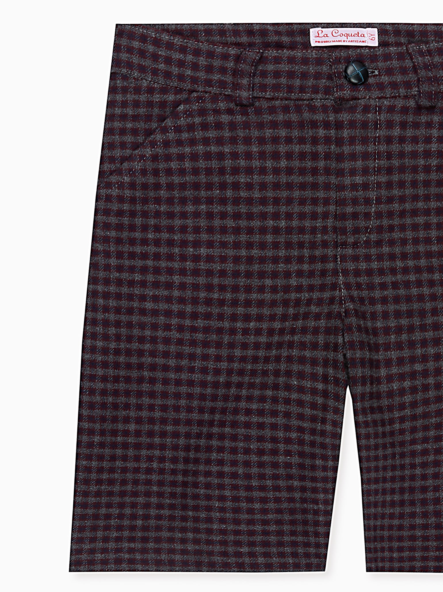 La Coqueta's Lucas Boy Shorts are perfect for the festive season. They are tailored in Spain from woven cotton with a tartan check pattern that washes and wears well with every use. They feature a full leg and high-rise shape that sits just above the hip for a classic, mid-century shape and unquestionable comfort, with belt loops, concealed pockets at the back and reinforced vertical pockets at the front. Modify for the perfect fit with the internal waist adjuster, with an elasticated waist and hidden buttons to make the waistline smaller or larger, ensuring your little one gets as much wear as possible during growth spurts. Finished with a knotted leather button fastening and zip fly, this version is rendered in versatile tones of burgundy and navy for endless style possibilities. Coordinate with a younger sibling wearing the Coroza Baby Dungarees for those adorable, perfect-picture moments.