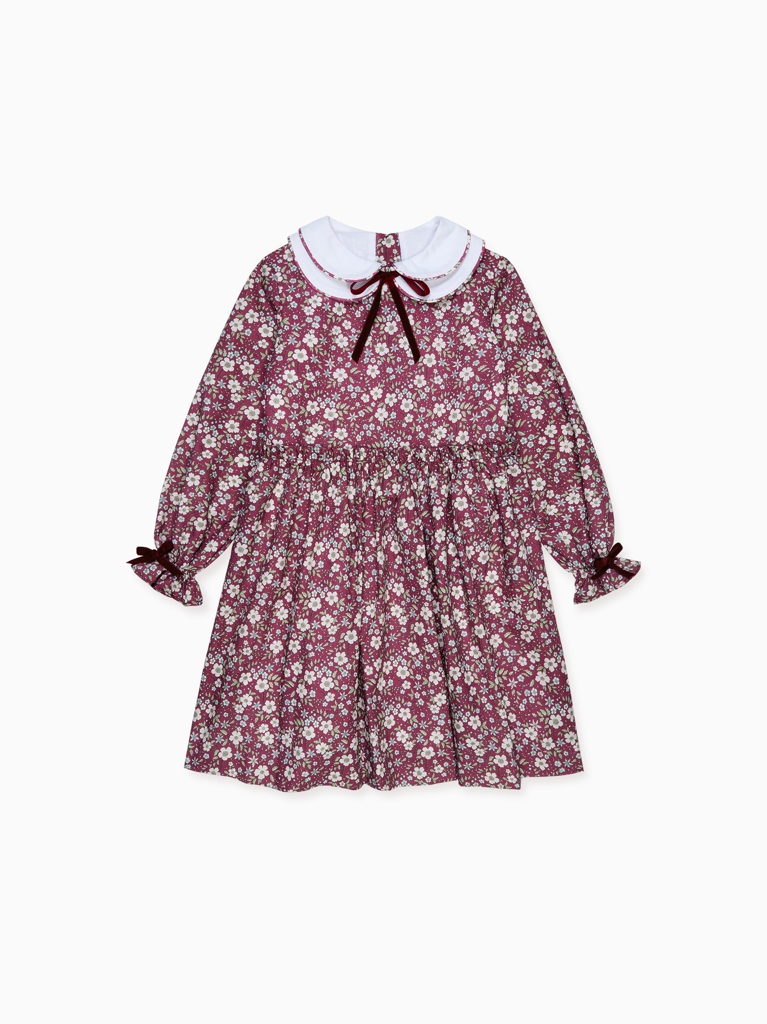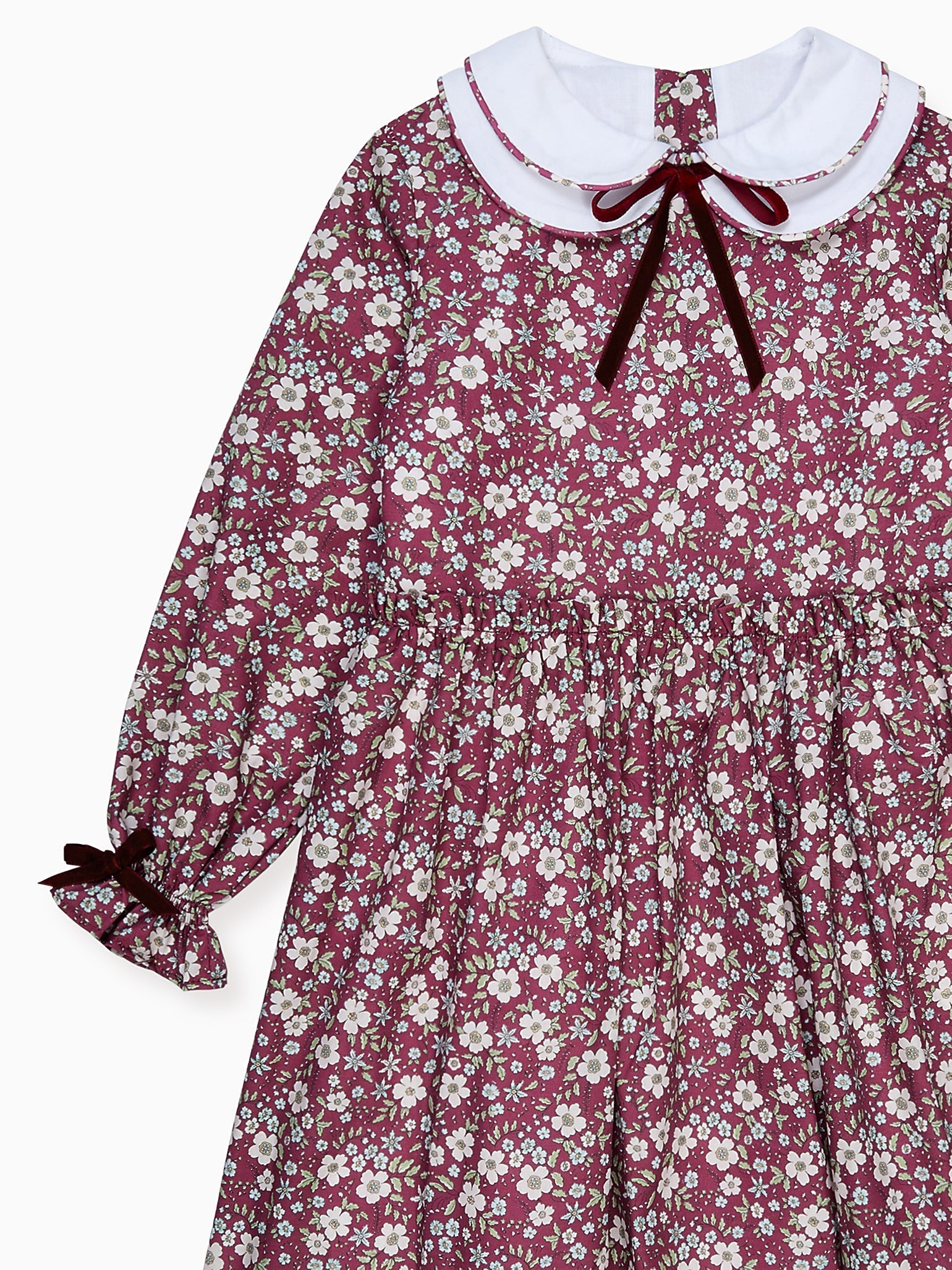 La Coqueta's ditsy prints pay homage to love for a bygone era, with our devotion to nostalgia and finery shining through in the Leana Girl Dress. This stunning girl's dress is cut from pure cotton and decorated with a stunning floral pattern exclusive to La Coqueta, in delicious hues of soft green and ivory on a full-bodied burgundy base. It has a charming layered Peter Pan collar, delicately trimmed with piping and a classic burgundy cotton velvet self-tie bow at the neckline. It has long sleeves finished with velvet bows, and a raised waist that creates a fit-and-flare silhouette, complemented by a long, flowing skirt. It buttons at the back with signature mother of pearl buttons and is fully lined with pure cotton for extra warmth and comfort all season long. Coordinate with a baby sister wearing the Palma Baby Girl Hand-Smocked Set for those adorable, perfect-picture moments.