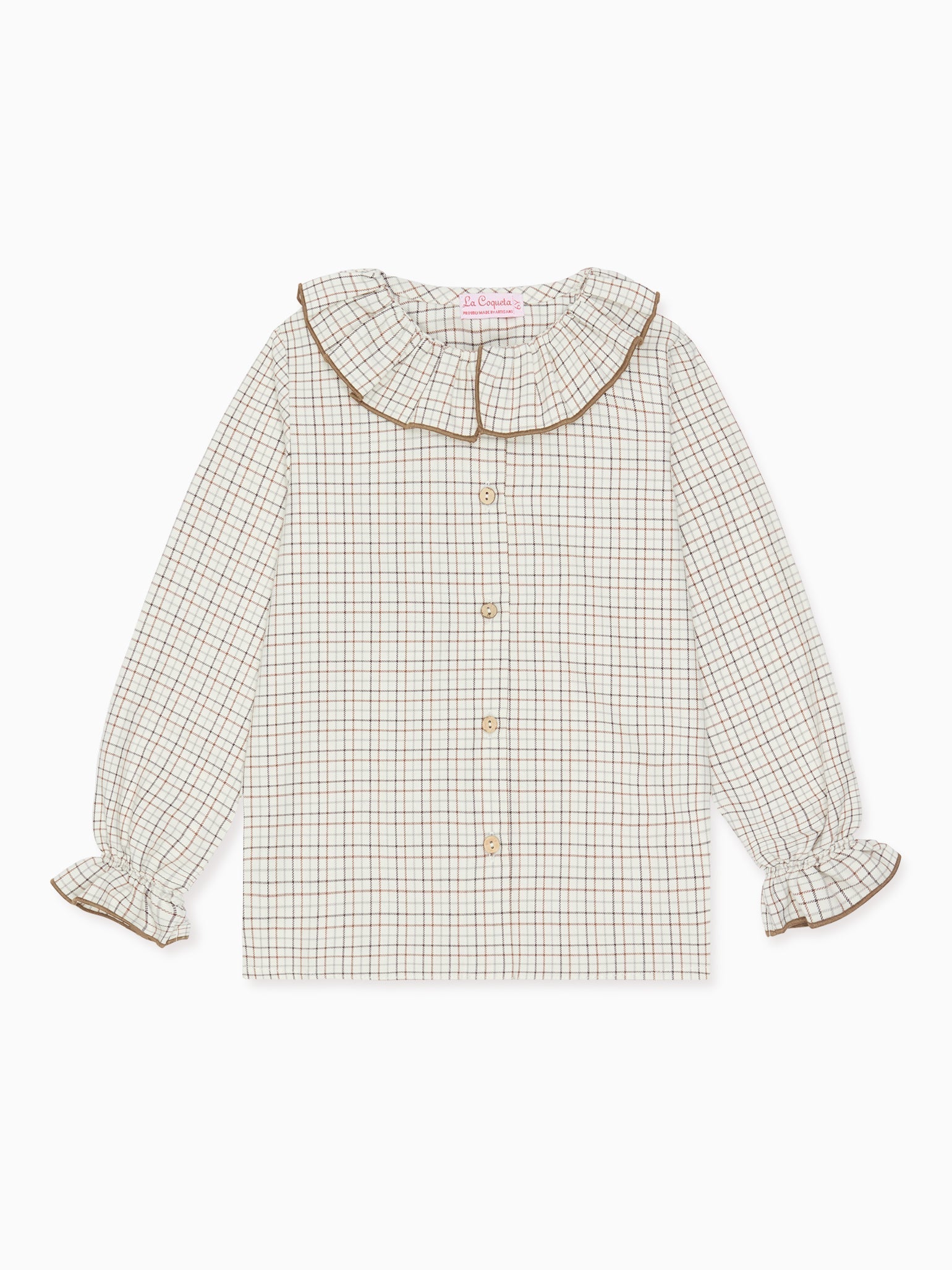 Celia Muñoz and the La Coqueta team design timeless staples that blend comfort, function, and elegance, keeping little ones stylish and comfortable, whatever the weather or occasion. La Coqueta's Francisca Girl Long Sleeve Shirt exemplifies this commitment, expertly tailored from pure organic cotton, renowned for its lightweight, breathable properties and gentle touch on delicate skin. Organic cotton farming is a lower-impact crop, using no chemicals, fertilisers or pesticides to produce, which protects local habitats and the farmers who grow it. It is decorated with a check print in rich shades of caramel and boasts a loose, boxy silhouette with a delicate frill collar traced with a contrasting piped trim. This charming girl's shirt features elongated long blouson sleeves with gathered cuffs adorned with contrasting embroidered finishes. It has a handcrafted wooden button placket down the front to fasten, and whether worn untucked with jeans or dressed up with a skirt, this blouse seamlessly adapts to any occasion.