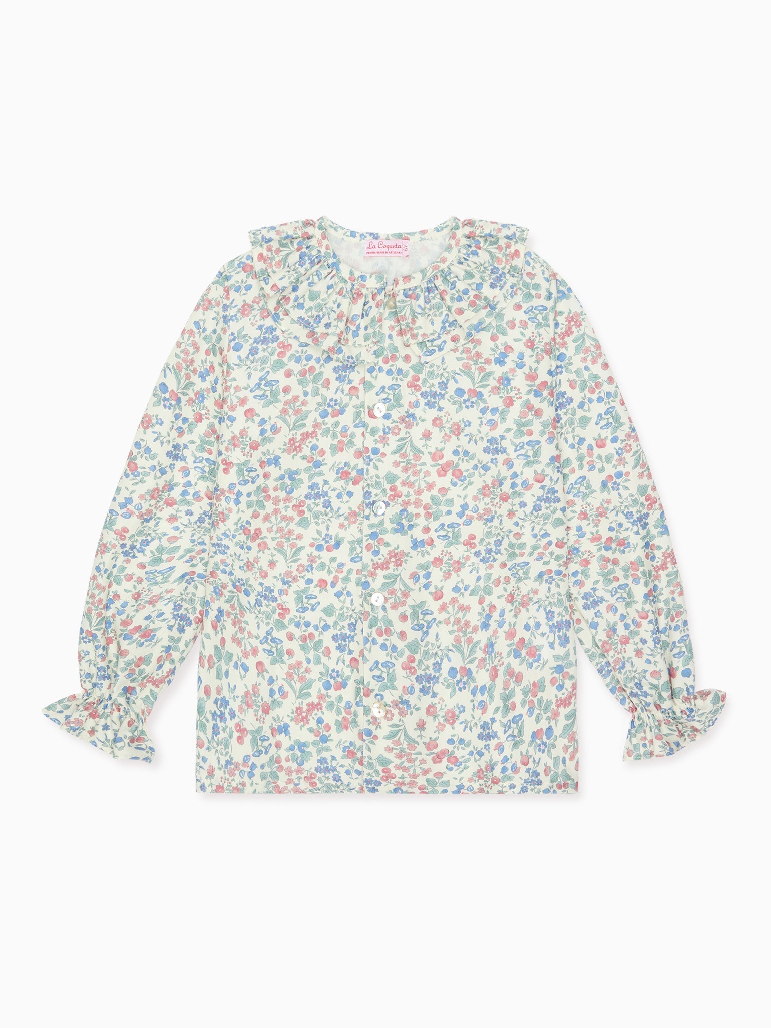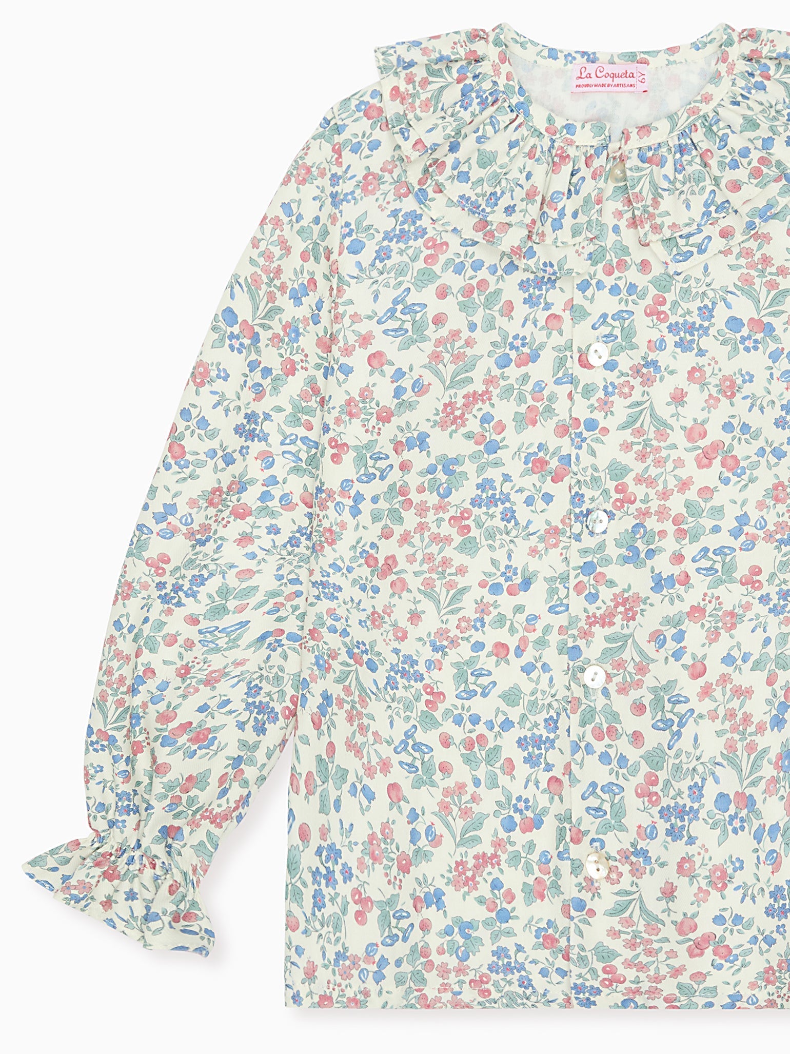 Celia Muñoz and the La Coqueta team design timeless staples that blend comfort, function, and elegance, keeping little ones stylish and comfortable, whatever the weather or occasion. The Lila Long Sleeve Girl Shirt exemplifies this commitment, expertly tailored from pure cotton, renowned for its lightweight, breathable properties and gentle touch on delicate skin. It features a relaxed, boxy silhouette with long blouson sleeves, adorned with a delicate cherry motif print in tones of soft red, green and blue on an ivory base. Completing its feminine charm is the mother of pearl button placket, gathered cuffs for a voluminous finish, and a delicately pleated frill tiered collar. Coordinate with a little sister wearing the Felixa Long Sleeve Baby Girl Shirt for those adorable perfect-picture moments.