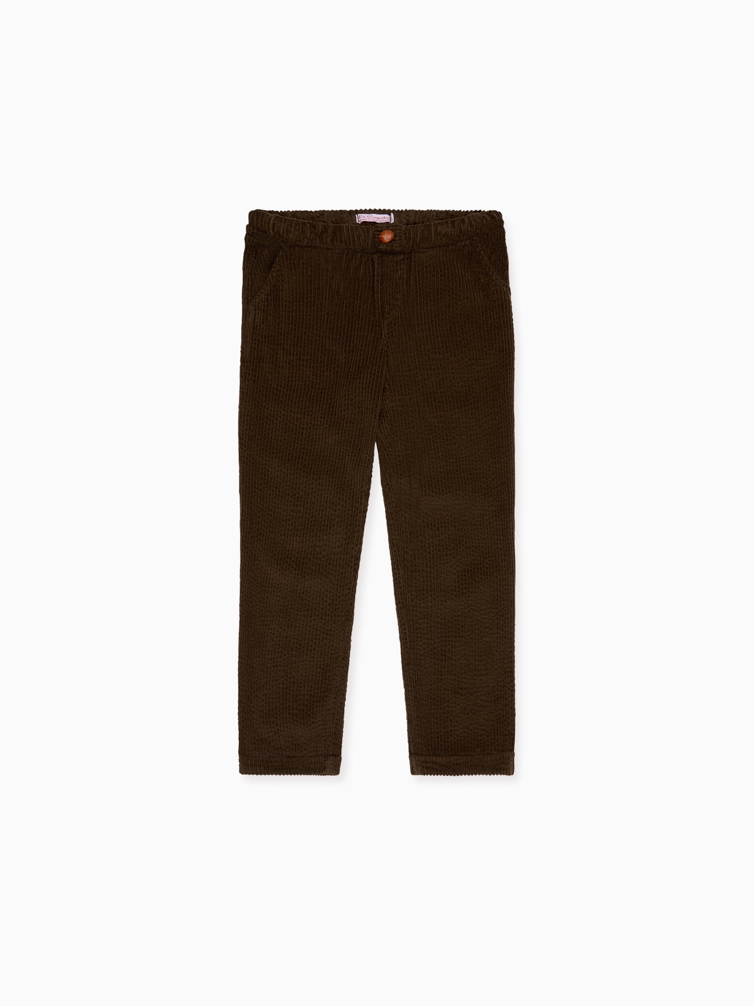 La Coqueta's Benito Corduroy Boy Trousers have a clean, stylish silhouette for year-round wear, crafted from high-quality cotton corduroy with a soft, almost broken-in feel. They have loose legs, concealed slant pockets at the front, patch pockets at the back for extra functionality, and an elasticated waist. Finished with a knotted leather button fastening and zip fly, this version is rendered in a rich shade of chocolate brown for endless style possibilities. A pair of La Coqueta trousers like this can be worn casually, layered with a classic polo or jumper, or dressed up with a formal shirt, and will become a wardrobe staple perfect for every occasion in your diary.