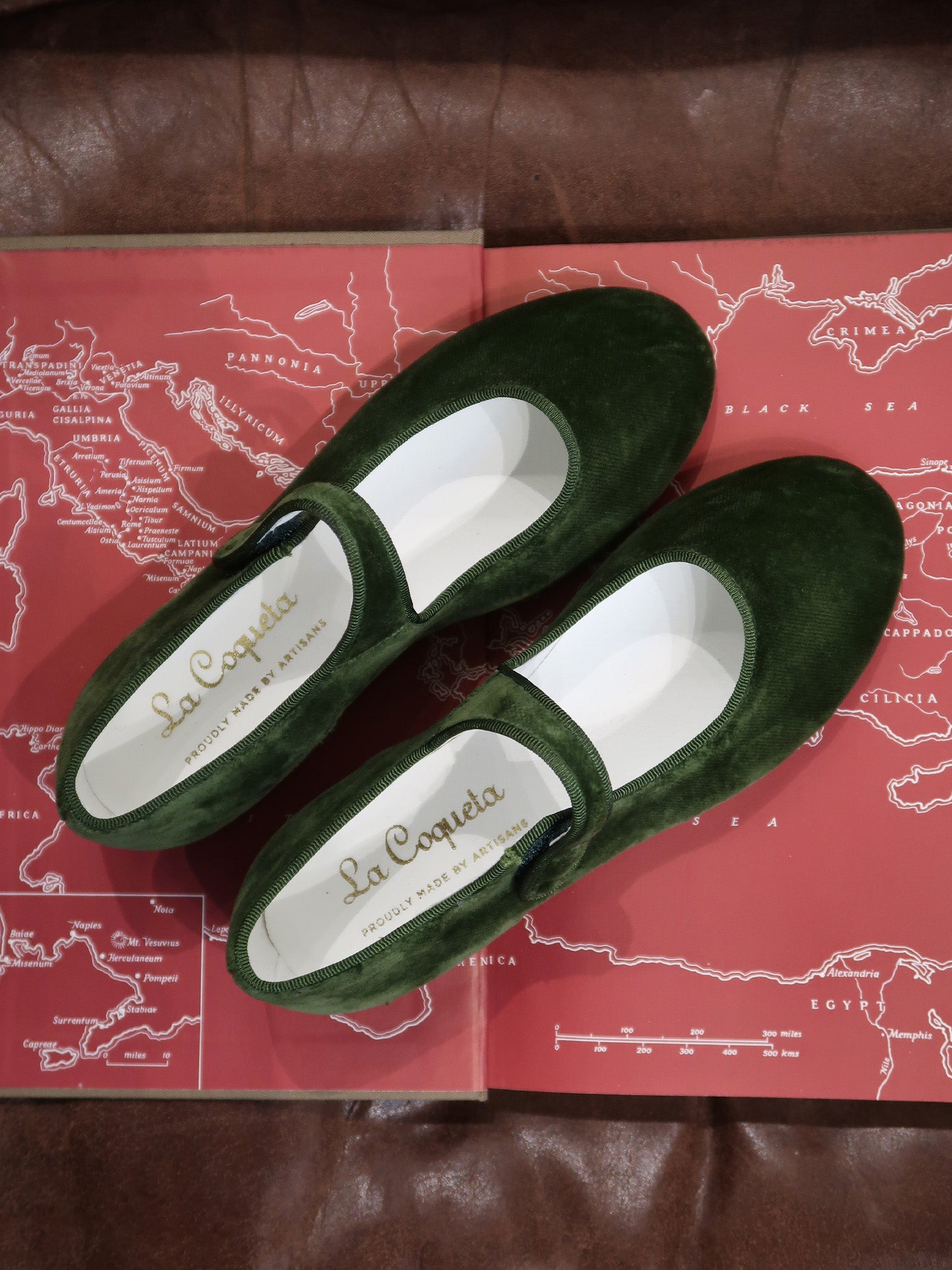 La Coqueta's exquisite designs are inspired by the traditional styles Founder and Creative Director Celia Muñoz grew up wearing in her native Granada. Handmade in Spain from luxurious cotton velvet, the Velvet Girl Mary Jane Shoes are the perfect choice for seasonal events and special celebrations. They fasten with a velcro strap, and have contrasting grosgrain trims, with a lightly padded rubber sole with a slight heel that ensures total comfort all day and night. This version comes in a rich shade of classic forest green that was designed with the festive party season in mind.