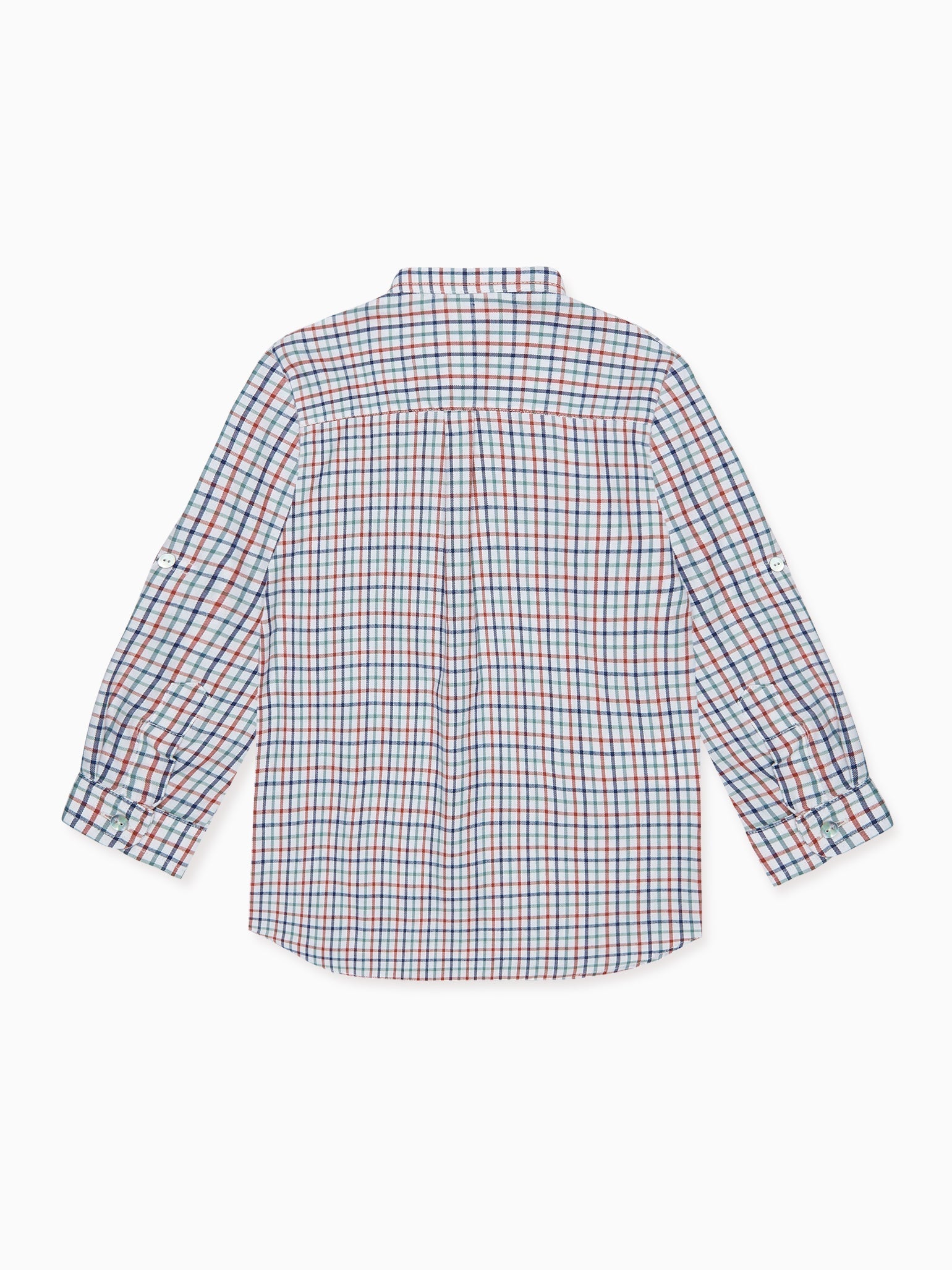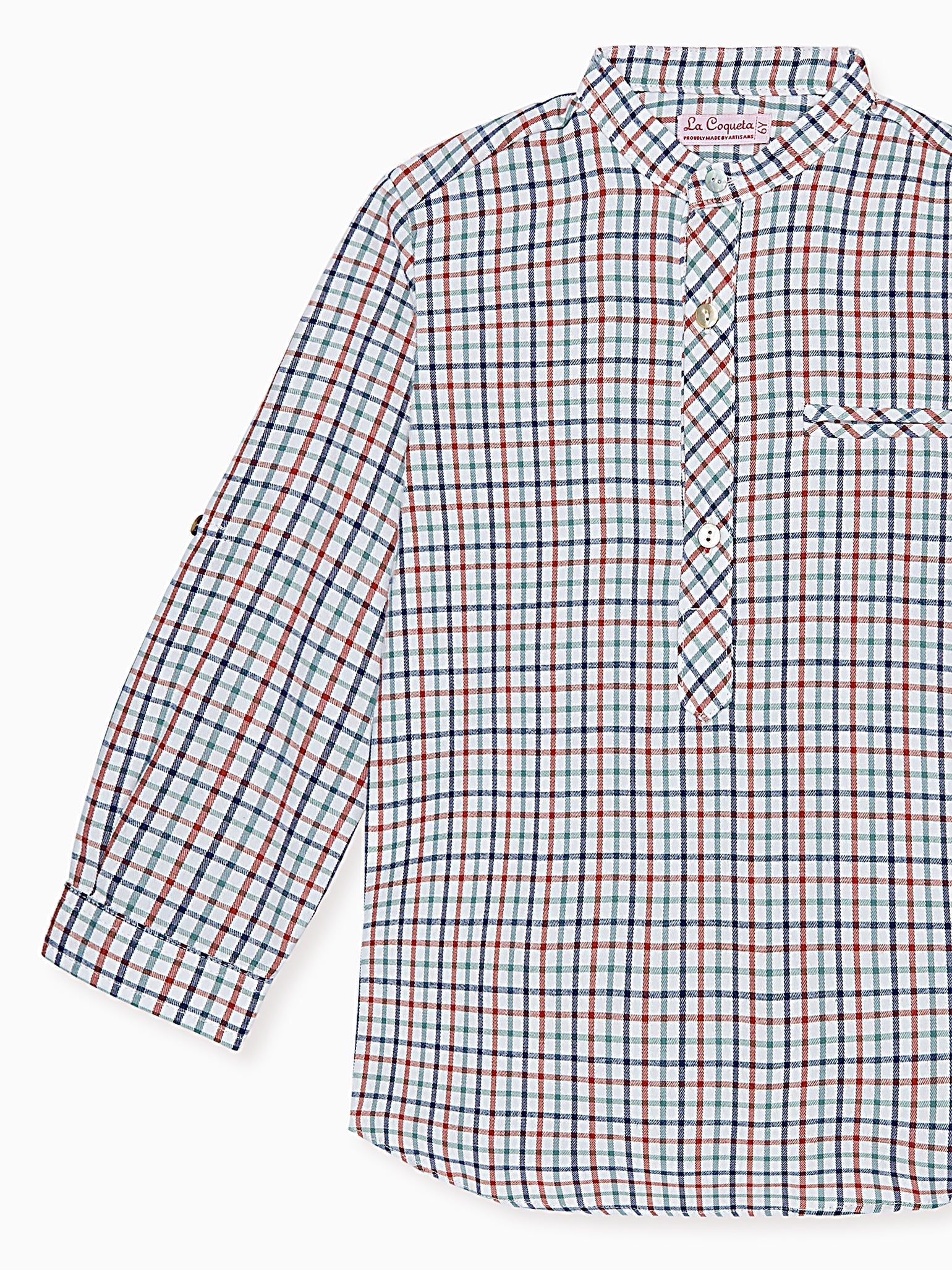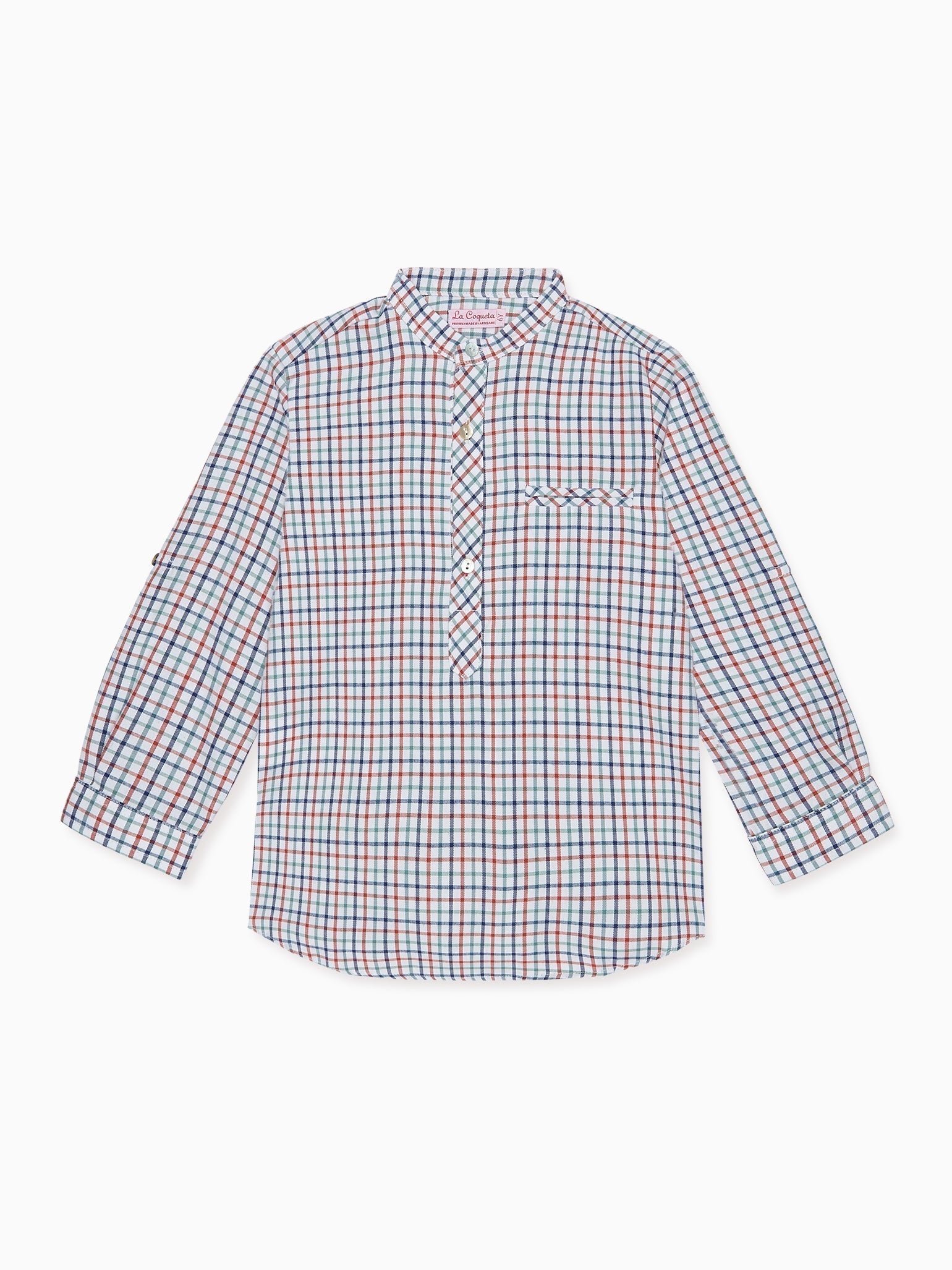 Celia Muñoz and the La Coqueta team effortlessly refine each silhouette over the years, tailoring every piece to ensure countless wear all season long. The Mateo Long Sleeve Boy Shirt is no exception, crafted from super soft cotton blend, tailored with a touch of polyester for extra durability, and printed with a charming ivory, blue and red check pattern. It features a stylish mandarin stand collar, a classic long-sleeve popover silhouette with mother of pearl buttons, and a classic centre box pleat for a relaxed fit that allows for a range of motion, perfect for little boys on the go. It has a curved hem and a single, rounded one-button cuff, with attached buttons at the elbow to roll up the sleeves for an alternative, more casual fit. Coordinate with a younger sibling wearing the Dante Long Sleeve Baby Shirt for those adorable, perfect-picture moments.