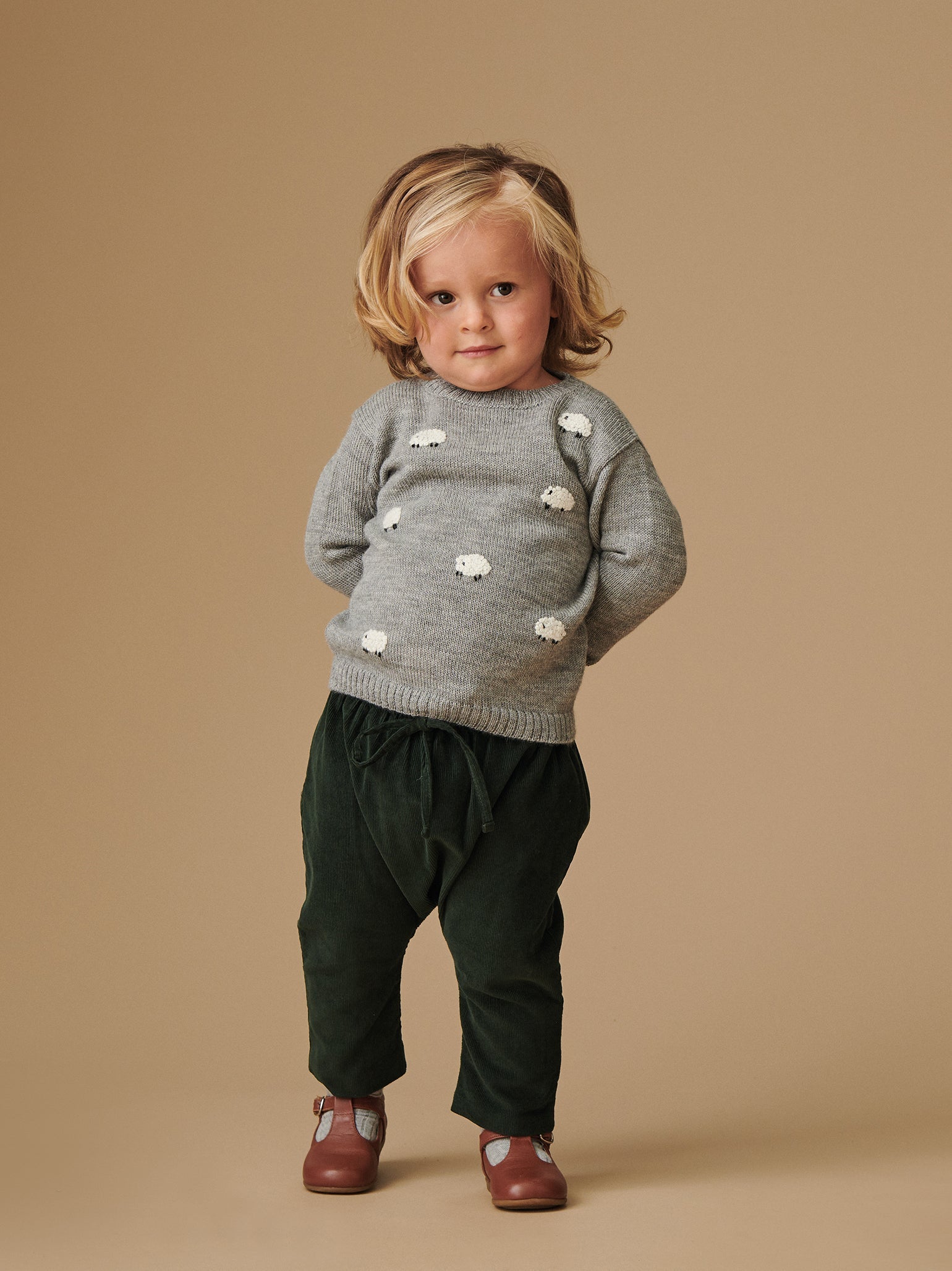 Colder days are made cosy with La Coqueta's Oveja Alpaca Baby Jumper, knitted from Peruvian pure baby alpaca wool that is up to seven times warmer and more insulating than lambswool, with softer, humidity-resistant and silkier qualities. This charming unisex jumper is rendered in a classic shade of grey and features long raglan sleeves, dropped shoulders and chunky ribbed cuffs and hem. Decorated with adorable textured intarsia sheep motif details, it has such a whimsical feel. It is a true thermal regulator, adapting perfectly to cold and mild temperatures, which is ideal for dressing your baby during unpredictable weather changes.