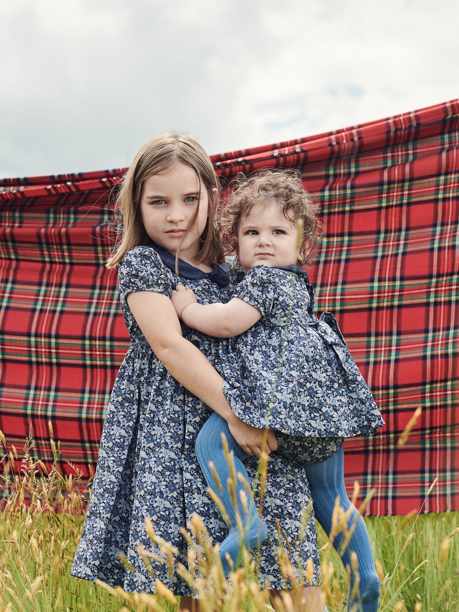 Heritage is at the heart of La Coqueta, with Founder and Creative Director Celia Muñoz's designs developing from her Spanish roots and the traditional clothing she grew up in. Known for rich embroideries and hand smocking, heavy collars, and decorative details, every collection manifests in elaborate yet elegant designs. The Arcadia Girl Hand-Smocked Dress is an iconic silhouette, crafted from pure cotton that is machine washable, breathable and kind to even the most delicate skin, ensuring your little girl keeps cool and comfortable all season long. The bodice is shirred across the waist and finished with intricate honeycomb smocking and contrasting embroidery across the empire line waist, which is completed by hand and can take up to seven hours per dress. Special details include the short capped sleeves and a long, floaty skirt, fully lined with pure cotton, and a charming layered velvet Peter Pan collar for a statement finish. This dress features an exclusive print meticulously designed in-house at our Notting Hill studio. Inspired by vintage botanical illustrations, delicate floral motifs were first hand-rendered in fine detail before being digitally refined and printed in Spain in small runs of fabric. The result is a soft, painterly pattern in navy blue and soft lilac hues, perfectly complementing the feminine details. Fasten at the back with mother of pearl buttons and a self-tie bow, and coordinate with little sister wearing the Arcadia Baby Girl Hand-Smocked Set for those adorable perfect-picture moments.