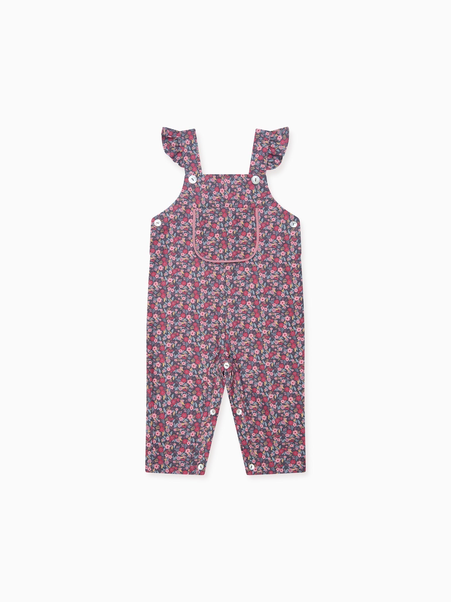 La Coqueta's Delphina Baby Girl Dungarees are perfect for elevating fuss-free nursery looks all season long, with their laidback style that can be easily dressed up or down. Crafted from pure cotton and decorated with a retro floral print in tones of pink on a classic navy base, they have a relaxed silhouette with long legs, dropped underarms and statement frilly butterfly sleeves. There's a handy patch pocket at the front, ideal for clipping on a soother, with mother of pearl buttons at the sides, straps and crotch for easy changing when out and about. An invaluable asset to your baby's growing nursery wardrobe, they allow for total freedom of movement and can be layered over body vests and baby shirts, with knitwear for extra warmth.