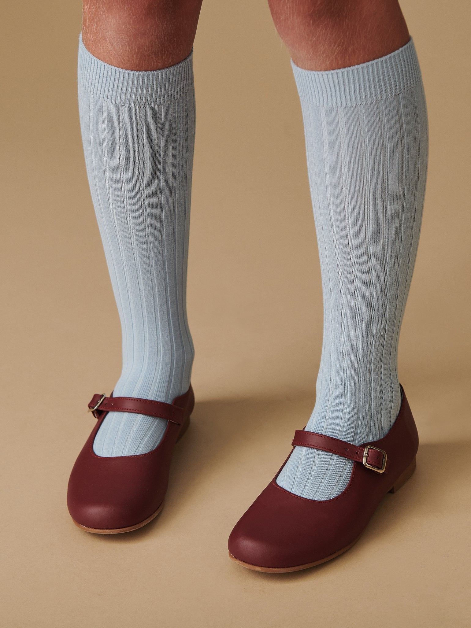An essential to finish off any outfit, add that final La Coqueta touch with our gorgeous cotton-rich Pale Blue Ribbed Knee High Kids Socks. Made from a super-soft cotton blend knit, these classic wardrobe staples have plenty of stretch for maximum comfort. Proudly made in Spain, our hosiery comes in every colour you can imagine, with a wide range of socks and tights to perfectly compliment our kid's leather shoes. Great come rain or shine, these traditional ribbed socks are perfect for any occasion. Available in Ribbed Kids Tights and Ribbed Short Kids Socks versions, ideal for matching sibling styles.