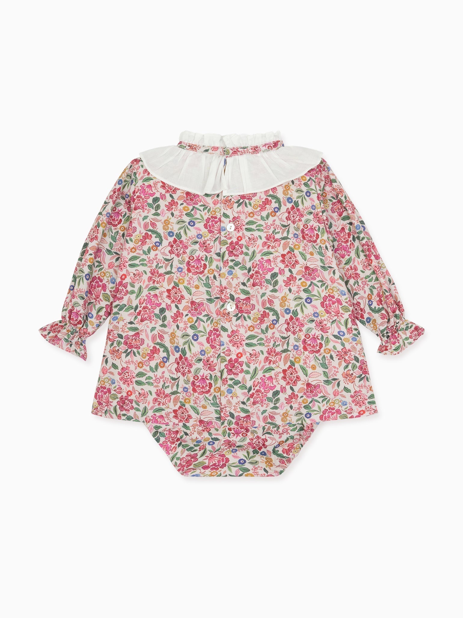 Every piece designed by Celia Muñoz is a testament to La Coqueta's love for attention to detail and Spanish craftsmanship, inspired by the styles that Celia grew up with in her native Granada. The Odisea Baby Girl Set is no exception to La Coqueta's commitment to the finer details, crafted from the most decadent cotton decorated with an illustrative floral print, exclusive to La Coqueta, in shades of pink and green on an ivory base. This traditional two-piece A-line dress set has an airy, relaxed feel, with long blouson sleeves that are gathered at the cuffs. Statement features include a stunning peasant collar in contrasting white, delicately pleated and finished with a self-tie bow around the neck. The top fastens at the back with a signature mother of pearl button placket and is fully lined in pure cotton for extra comfort and coverage, and the matching bloomers are elasticated at the waist for fuss-free changing when out and about. Pair with the matching Girl Soft Ribbon Bow Clip and coordinate with a big sister wearing the Laurelia Girl Empire Dress for those adorable, perfect-picture moments.