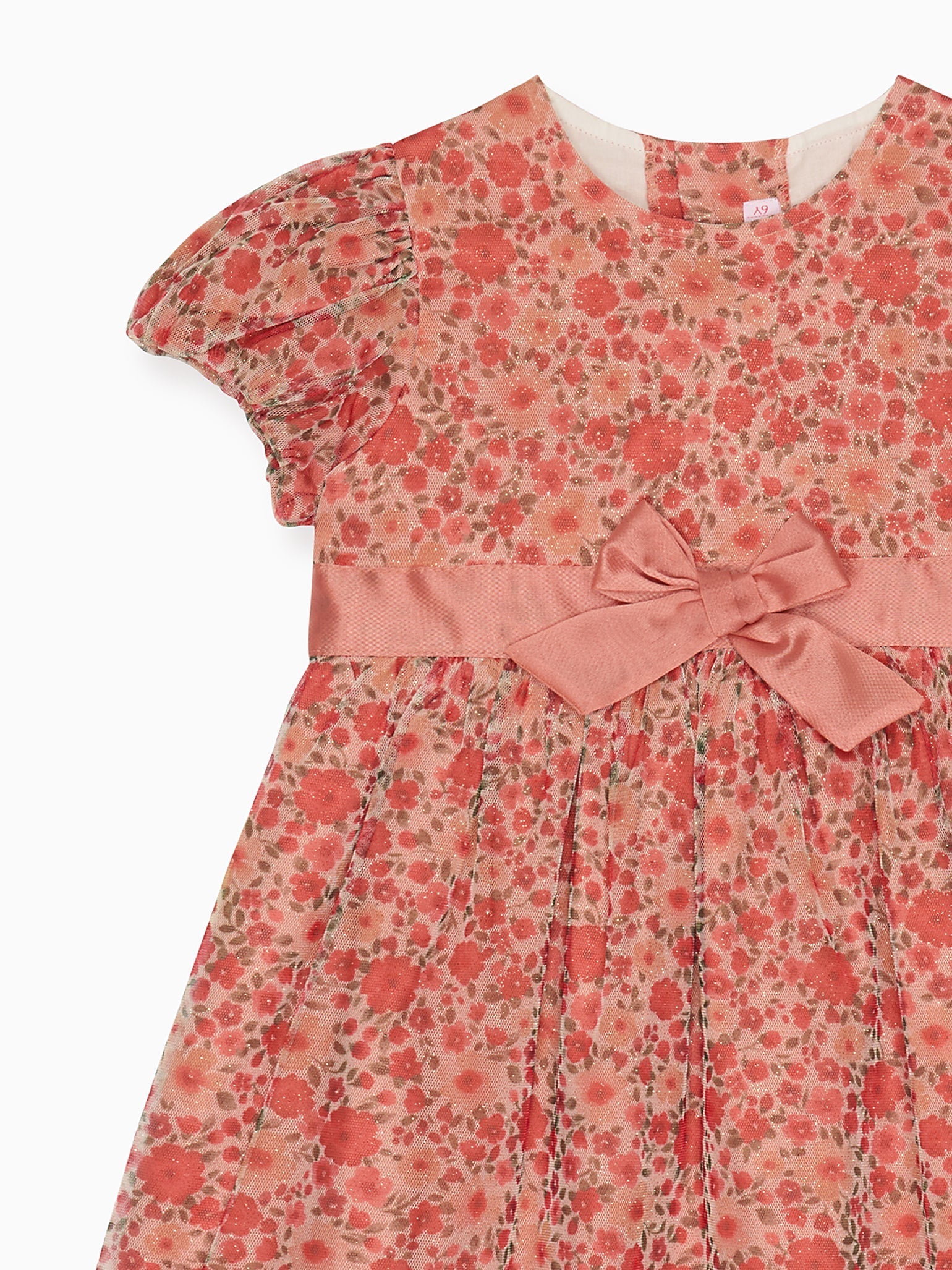 Discover the spirit of joy that La Coqueta creates with the latest luxury children's collection, perfect for special occasions, with Celia Muñoz's magical pieces for birthdays and festive celebrations. Let your little girl dance late into the evening with La Coqueta's transcendent Lillana Girl Dress, perfect for whirling and twirling on her special day. It has a fit and flare silhouette and is cut from lightweight sheer organza polyester, which has a magical shimmery finish and is delicately adorned with a stunning floral print and a satin ribbon bow around the waist. It has short capped sleeves, a classic round neckline, and a floaty skirt cut above the knee. It is fully lined for extra coverage and a feminine, vintage-inspired silhouette, and has a signature mother of pearl button placket to fasten at the back.