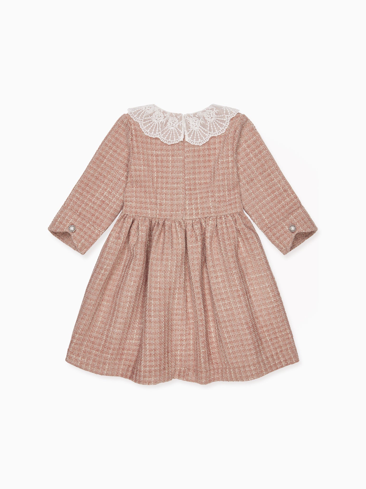 Create memories to last a lifetime with La Coqueta's Theodora Girl Dress, an enchanting piece crafted for your little girl's most special moments. This elegant fit-and-flare dress is made from heavyweight woven polyester to create a stunning pink tweed fabric, beautifully accented with French lace details that evoke a decadently feminine allure, perfect for celebrating in style. The flowing silhouette exudes a regal charm, while the raised waistband ensures a comfortable and flattering fit. Ideal for any occasion, from birthdays to weddings and special ceremonies, the Theodora Girl Dress promises your daughter will be the centre of attention. Fully lined with pure cotton for added comfort, it features charming three-quarter sleeves, a delicate French lace collar, and a floaty skirt. Proudly made by artisans in Spain with special moments in mind, this dress is destined to become a cherished heirloom in her wardrobe. Fasten at the back with a concealed zip for easy dressing.