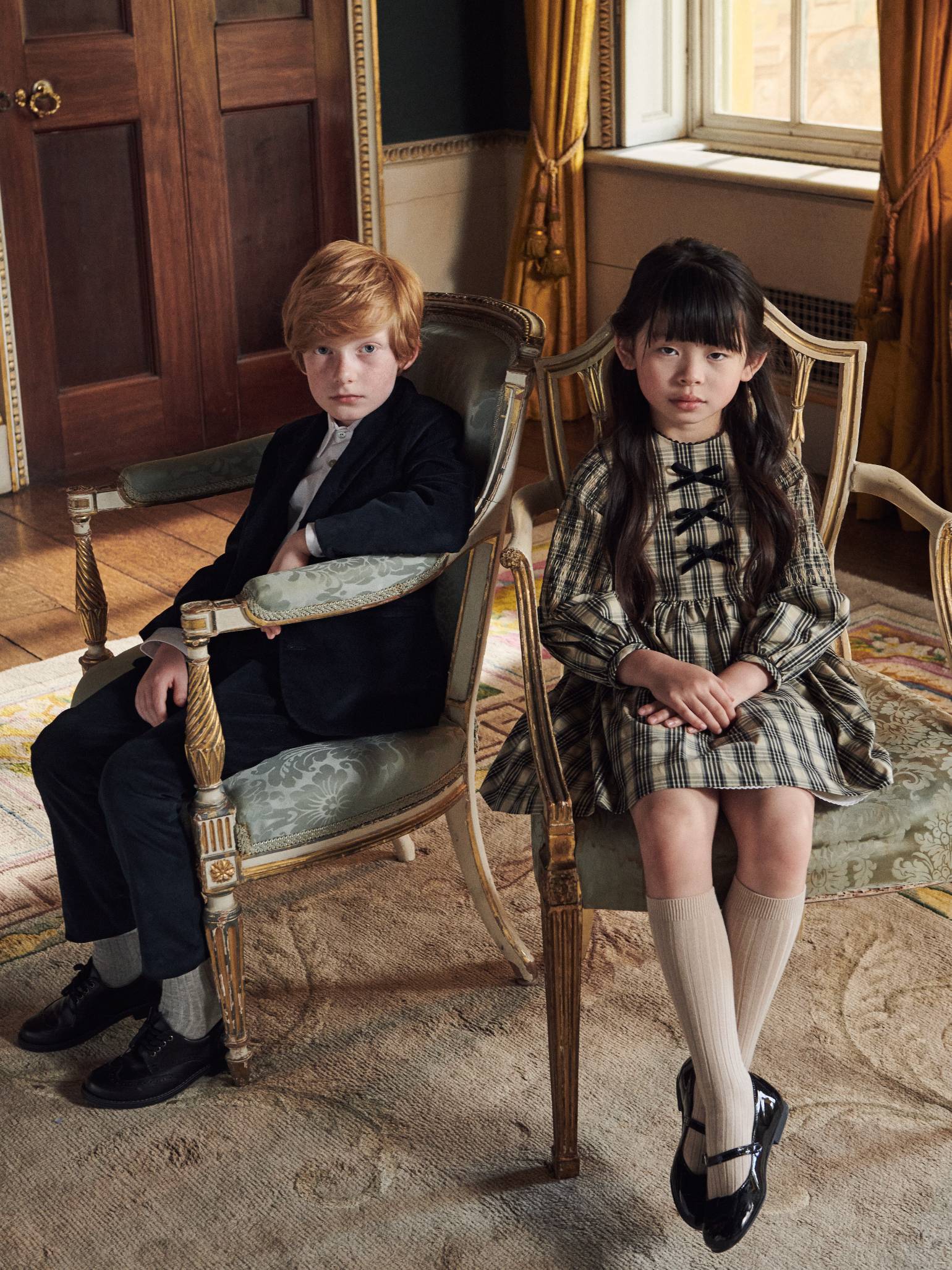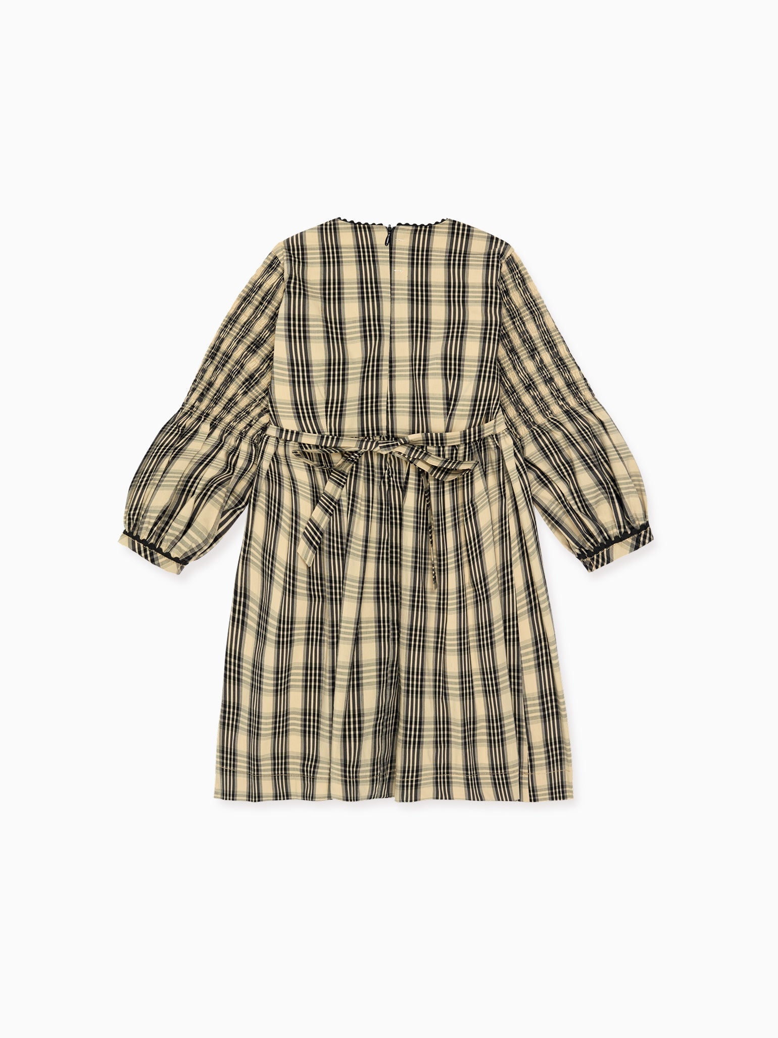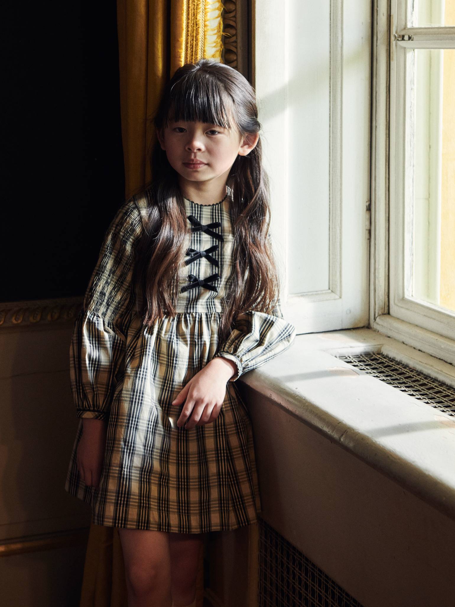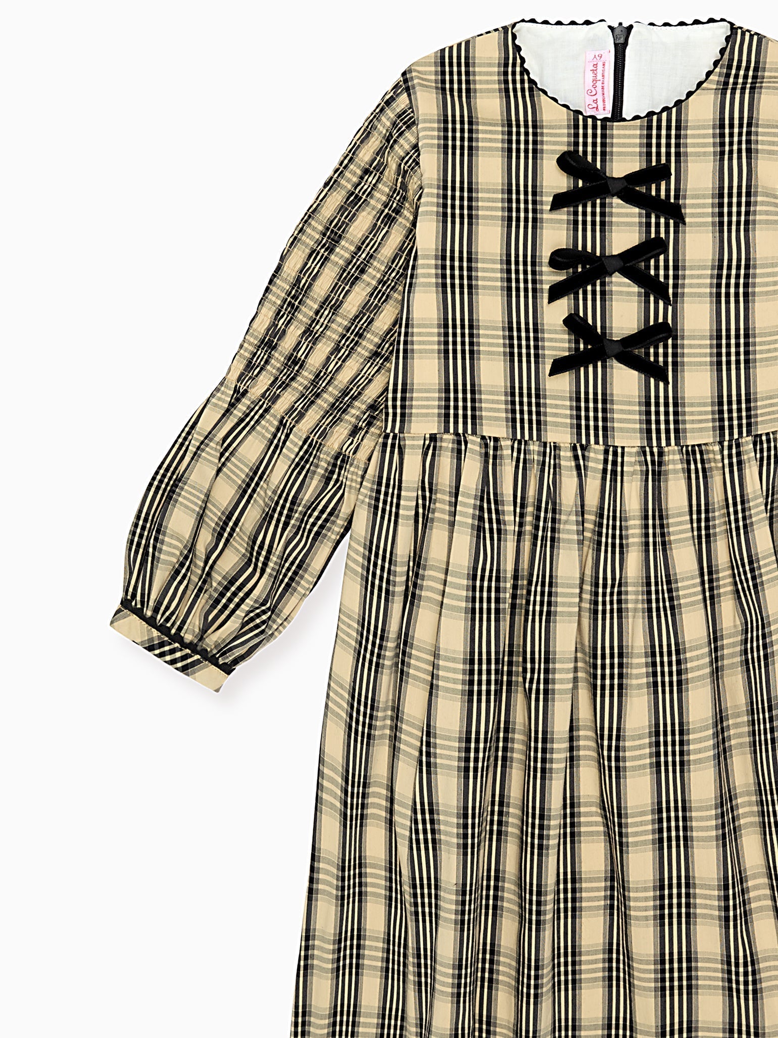 Every piece designed by Celia Muñoz is a testament to La Coqueta's love for attention to detail and Spanish craftsmanship, inspired by the styles that Celia grew up with in her native Granada. The Claudette Girl Dress is one of those pieces your little girl will wear on repeat all season long. This long-sleeved girl's dress is perfect for the colder weather, crafted from a silky blend of cotton tailored with a touch of polyamide and elastane for extra stretch and durability and decorated with a charming black tartan check on a sand base. It has a charming round neck traced with ric rac trims and black velvet bow details on the yoke, with shirred long blouson sleeves that are capped at the cuff for a voluminous effect. It fastens at the back with a simple zip and is fully lined with pure cotton for extra comfort and coverage. Coordinate with a little sister wearing the Odisea Baby Girl Romper for those adorable perfect-picture moments.