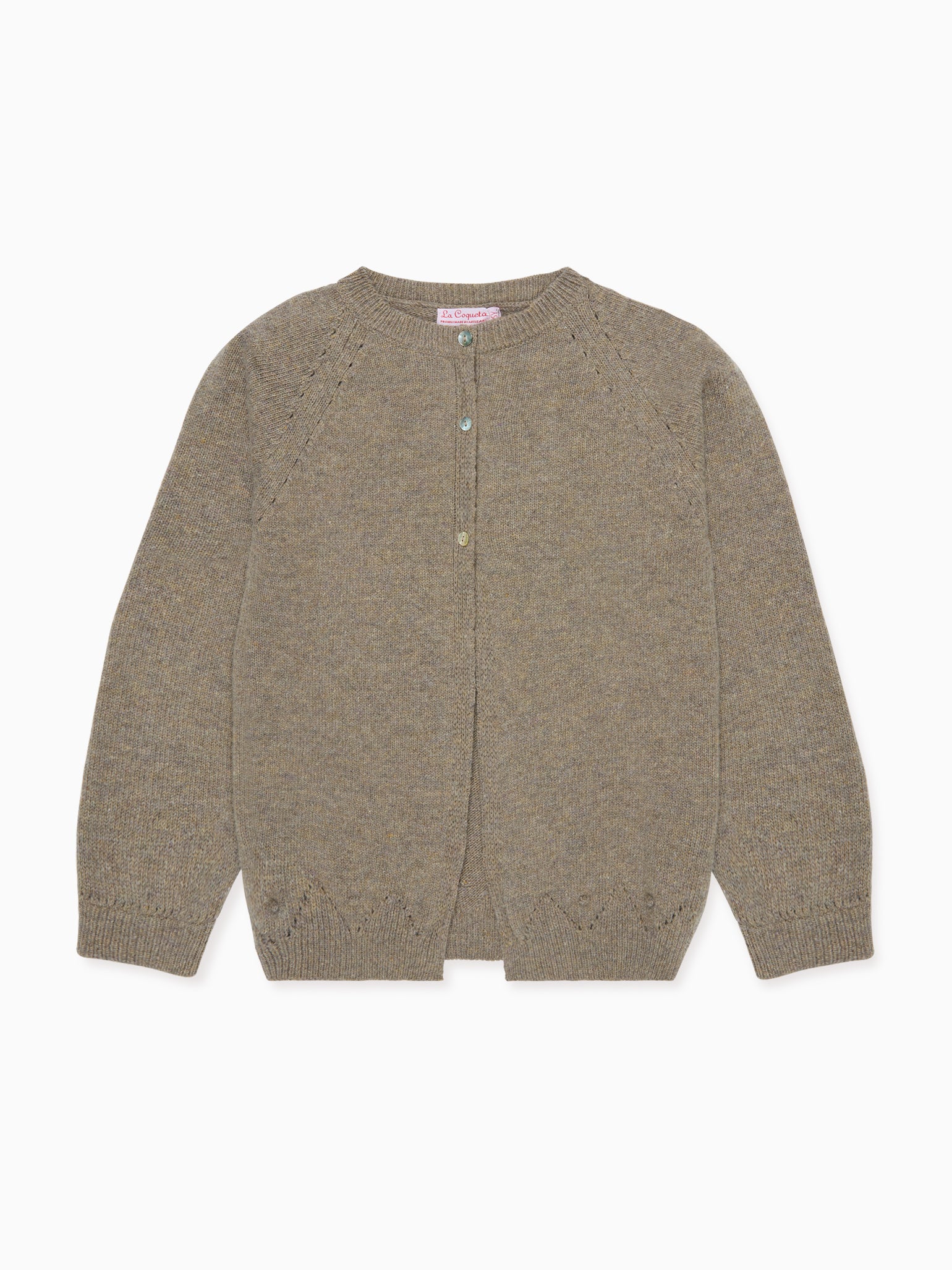 La Coqueta's Alvira Merino Girl Cardigan is a classic staple for the colder months, crafted in Spain from a luxuriously rich Merino wool blend, tailored with a touch of polyester for extra durability, in a universal shade of soft taupe. It provides an elegant styling piece for the cooler weather, with its versatile and easy-wearing functionality that can be layered over a classic cotton shirt or dress. It has dropped shoulders, long blouson sleeves and a relaxed fit, a round neck and a ribbed trim on the hems, offering utilitarian simplicity for everyday wear, with mother of pearl buttons to fasten. It has been delicately decorated with openwork patterns, offering a comfortable thickness and elevated aesthetic that can be worn at just about any event in your diary this season. Coordinate with siblings wearing the Axel Merino Boy Cardigan and Zas Merino Baby Cardigan for those adorable, perfect-picture moments.