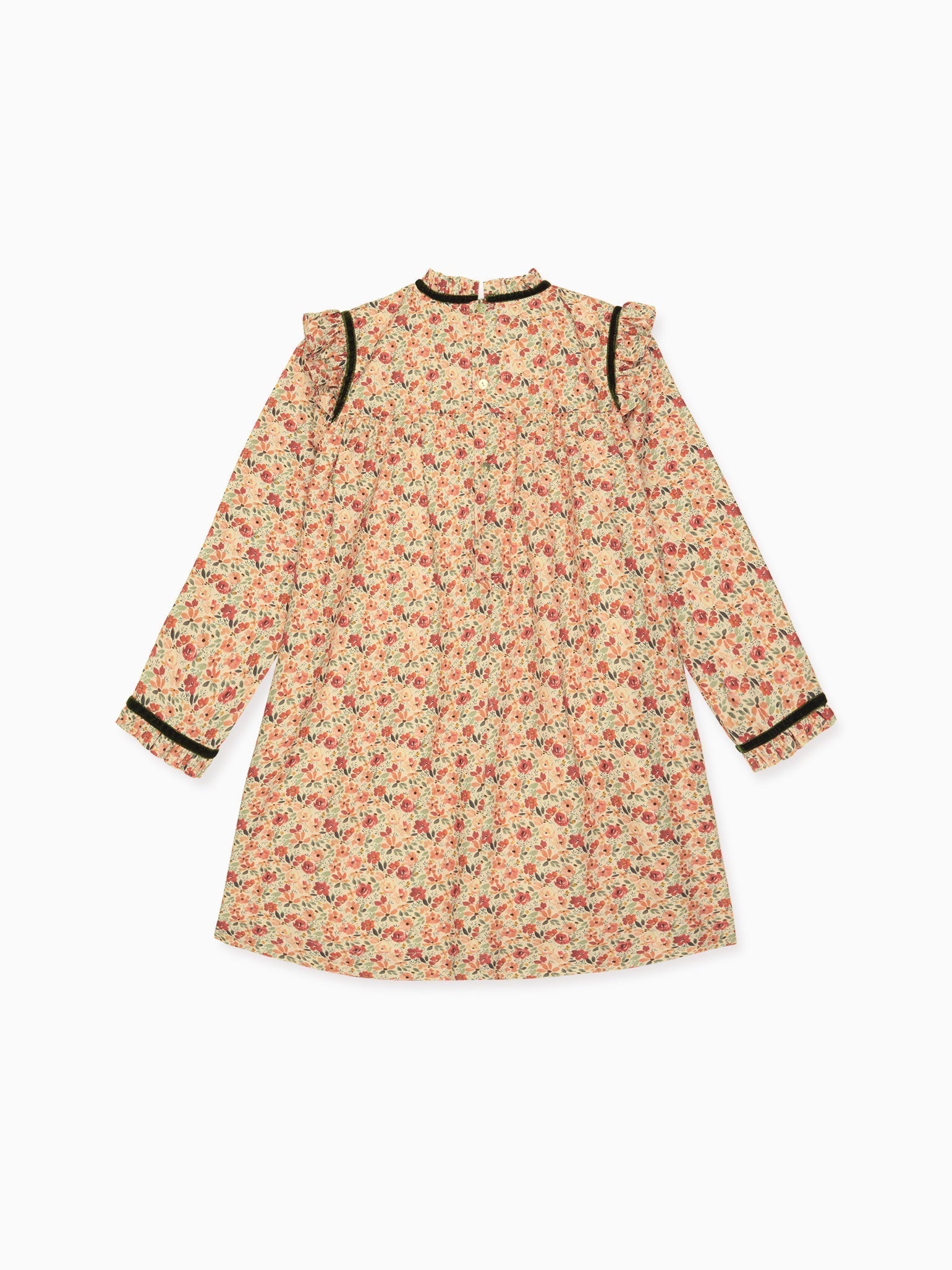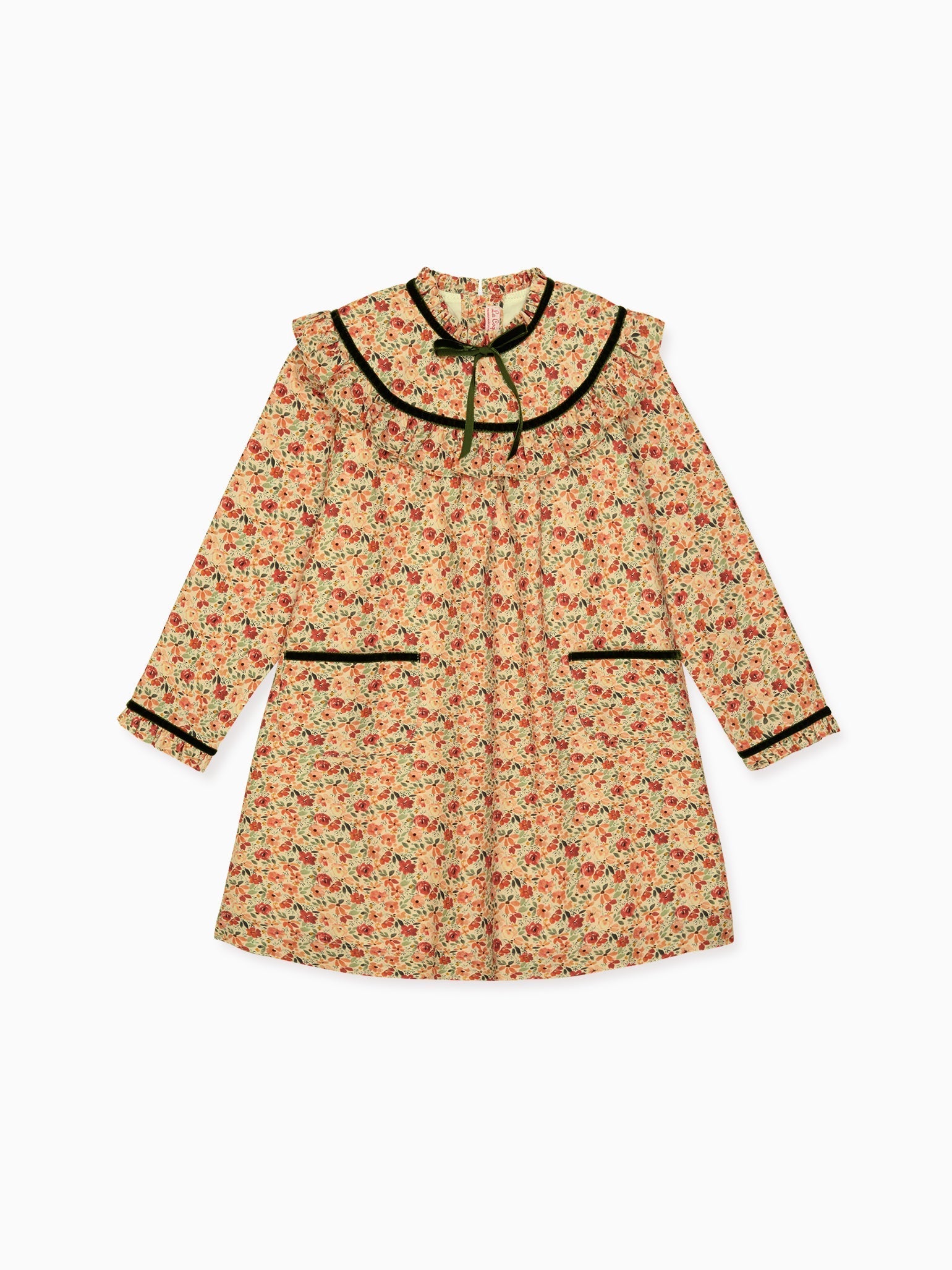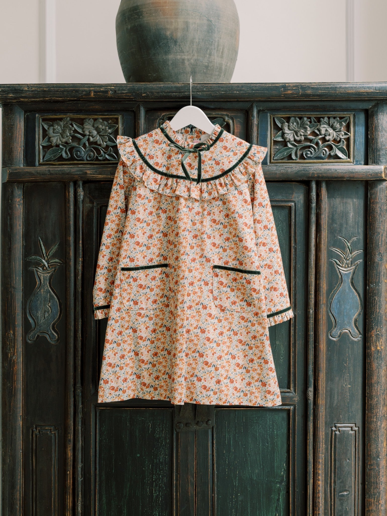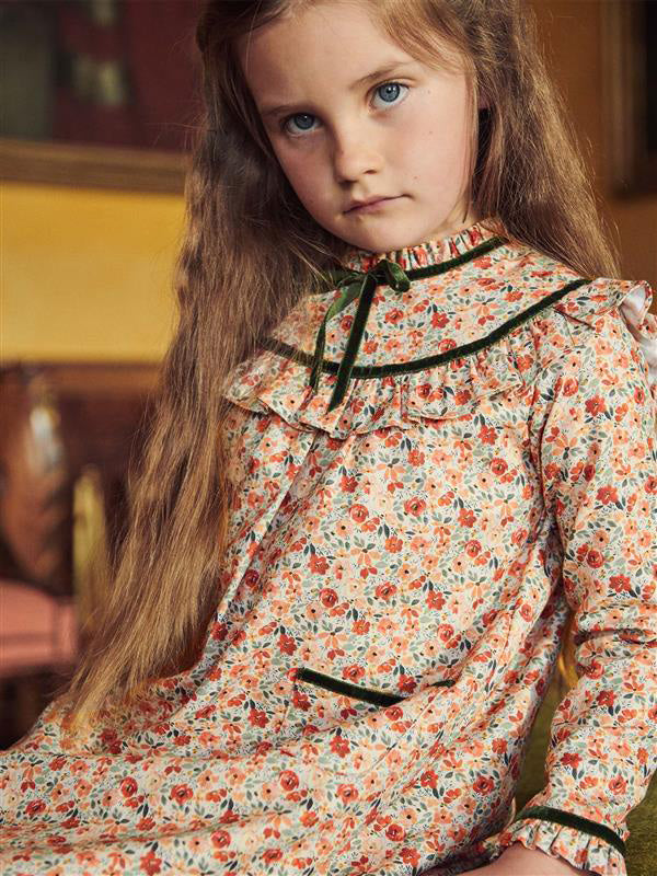 Flowing, vintage-inspired silhouettes define La Coqueta's aesthetic, and the Alita Girl Empire Dress is a stunning embodiment of this style. Crafted from luxuriously soft pure cotton, this dress feels light and elegant, adorned with an illustrative floral print in shades of terracotta. The long sleeves are accented with velvet trims and pleated finishes, adding a touch of sophistication. The curved silhouette, meticulously crafted by skilled artisans in Spain, leads into a floaty, relaxed skirt that swishes beautifully with every step, with handy patch pockets at the front. The delicately frilled peasant collar is complemented by whimsical green velvet finishes and a charming self-tie bow at the neck, showcasing La Coqueta's dedication to detail and craftsmanship. Fully lined in pure cotton for added comfort and coverage, the dress fastens discreetly at the back with a signature mother of pearl placket.