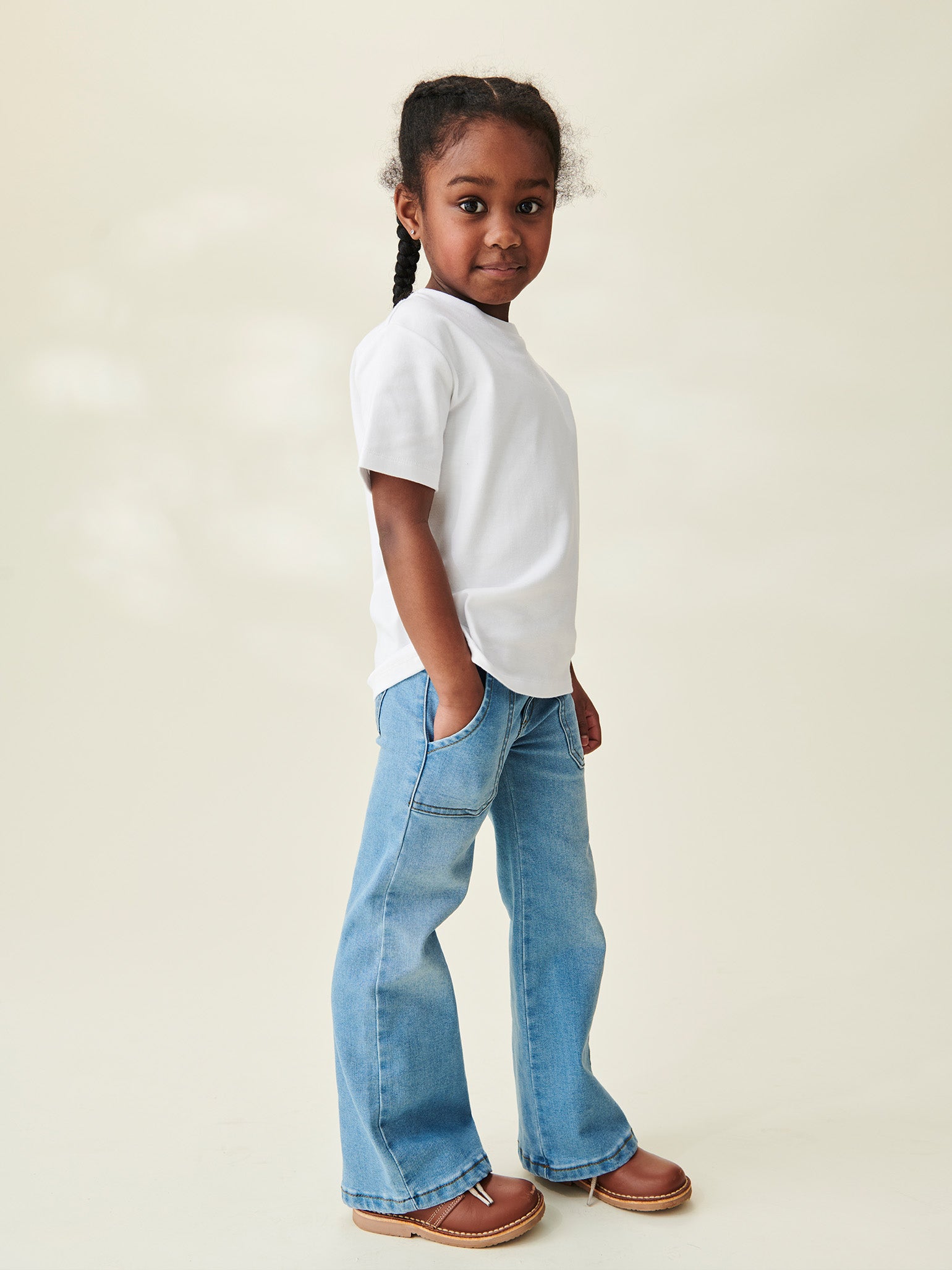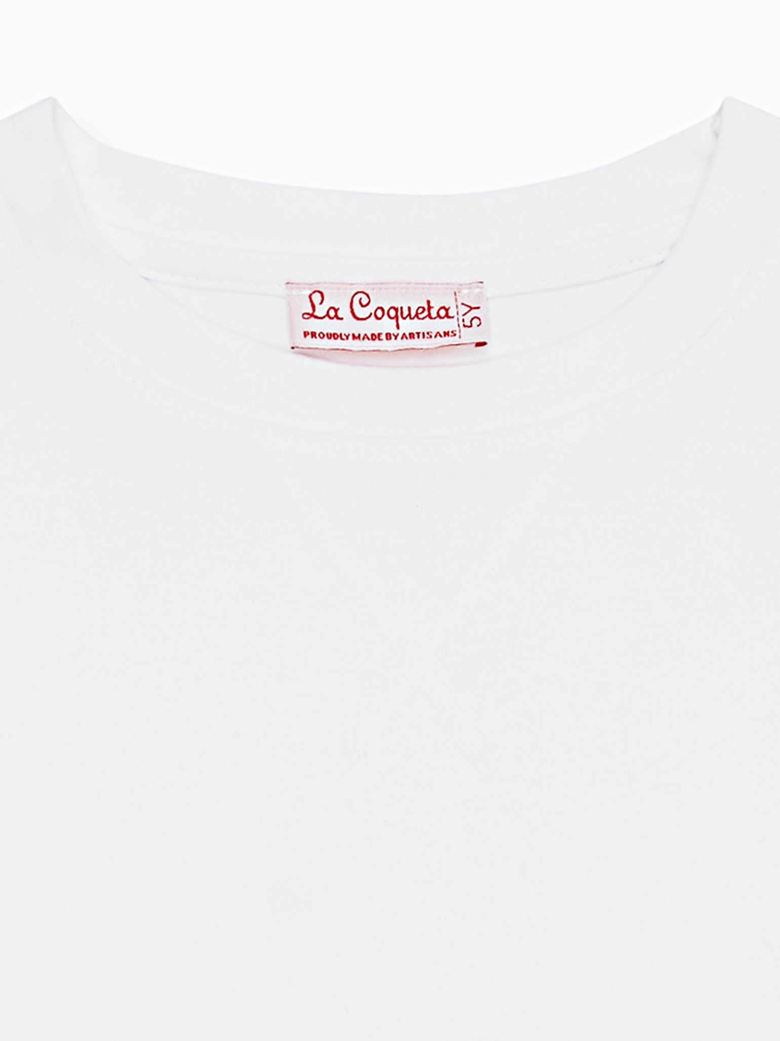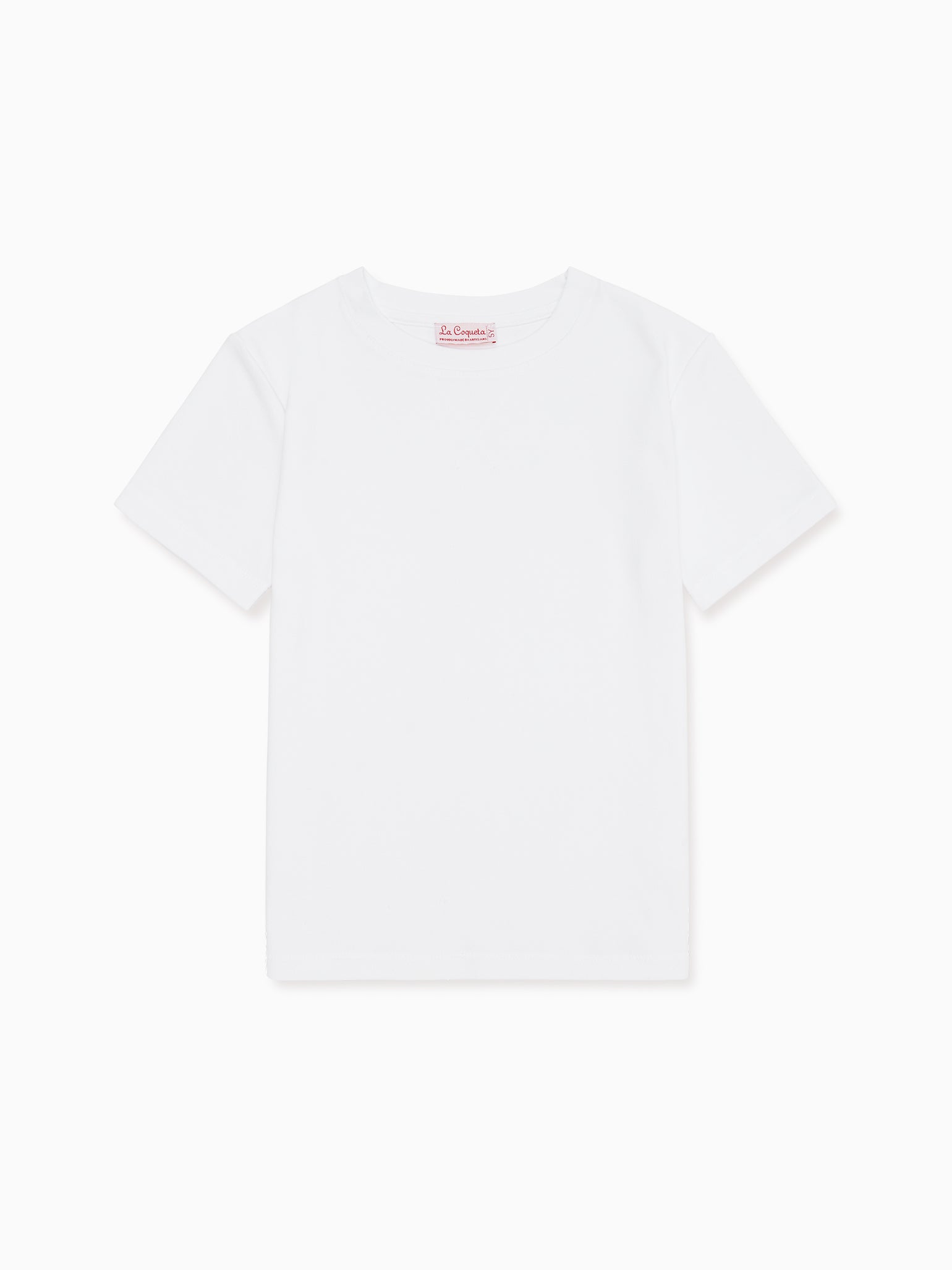 La Coqueta takes a pared-back approach with our jersey essentials, ensuring we create timeless, versatile and wear-on-repeat pieces that will be on high rotation all year round. The Arturo Kids Cotton T-Shirt is cut from responsibly sourced cotton jersey for a comfortable, boxy fit. It has an overlocked navy crew neck, dropped shoulders and relaxed short sleeves, perfect for girls and boys alike. Rendered in a classic white, pair it with La Coqueta's cotton-rich jeans or chinos for an effortless weekend outfit, or use it as a handy spare top during the school week.