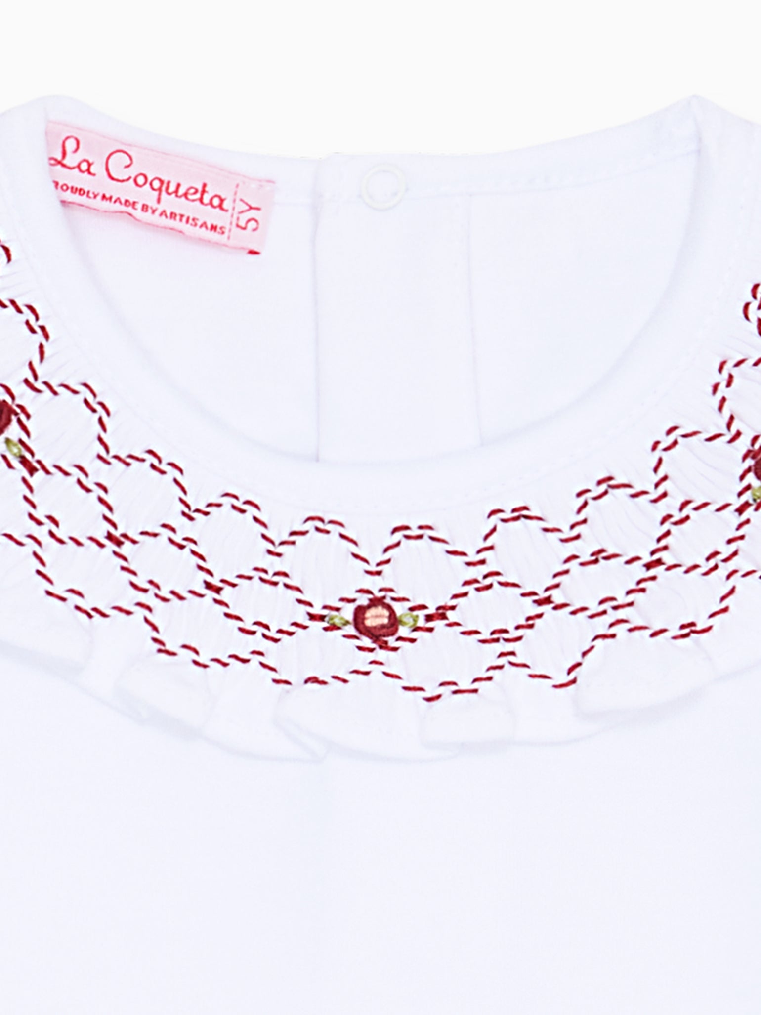 La Coqueta's Liliana Long Sleeve Girl Hand-Smocked Top is the perfect blend of elegance and practicality for everyday wear. Expertly crafted from 100% Peruvian Pima cotton jersey, it offers a luxuriously soft, lived-in feel. The relaxed, slouchy silhouette features long sleeves and slightly dropped shoulders for enhanced comfort, while the pull-on design allows for easy, fuss-free dressing. A charming frill collar, embellished with delicate honeycomb smocking and embroidered details in rich burgundy tones, adds a touch of sophistication. Finished with nickel-free poppers at the back of the neck, it ensures effortless changing throughout the season. Coordinate with a big sister wearing the Loretta Long Sleeve Baby Girl Smocked Top for those adorable perfect-picture moments.